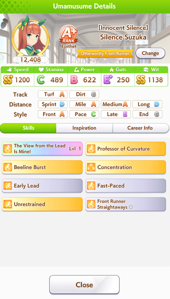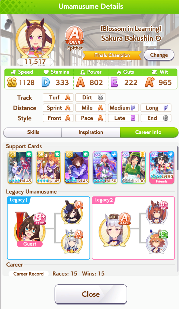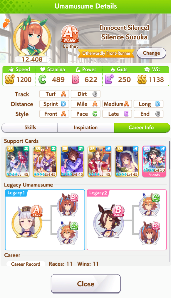 Вот за Сузуку тоже попробовал прокачать S ранг. За неё проще чем за Бакушин. У неё в поднятии потенциала уже есть все топовые скиллы. Но Повера всё равно не хватает. Я знаю как решить эту проблему. Нужно два предка с девятью спарками Повера воткнуть. Возможно даже одного хватит. Когда обновится пул заёмных предков, нужно попробовать.