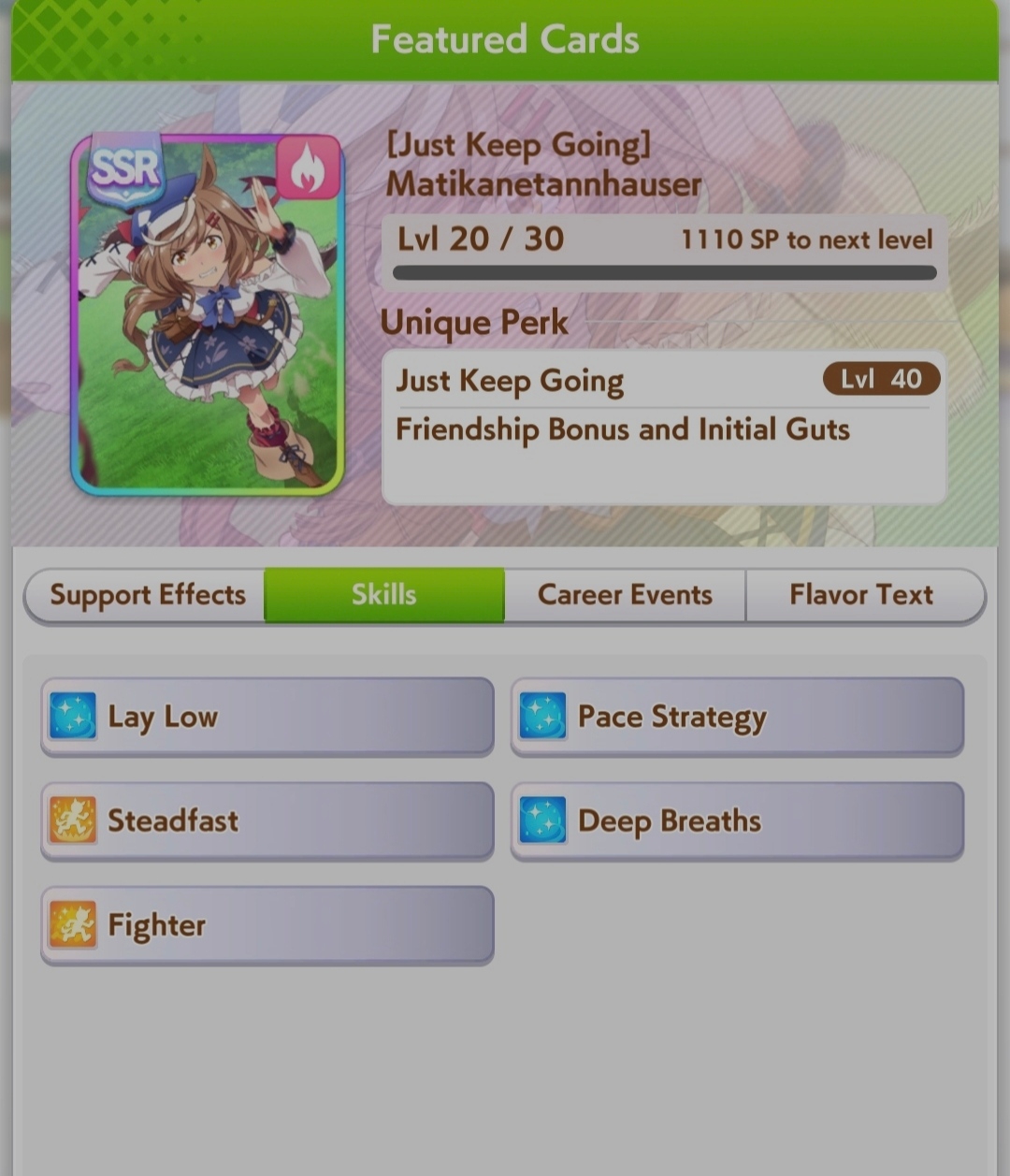 Доброй ночи аноны, подскажите юродивому, как собирать конях для длинных дистанций? Прикрепляю бомжацкую колоду это лучшее что было, серьезно, за 80 акков максимум видел 2 киты Добил почти всех до B+, но лонг жестко сосет, на некоторых даже психанул и не добил карьеру. Интернетные гайды все в стиле "тащем-та никакого секрета тут нет, собираешь 1000 спида и 900 стамины". А как, сука??? У них вилки не пересекаются, качаешь вместе со стаминой какой-то всратый гатс, в итоги имеешь бомжа уровня пикрил гоши.