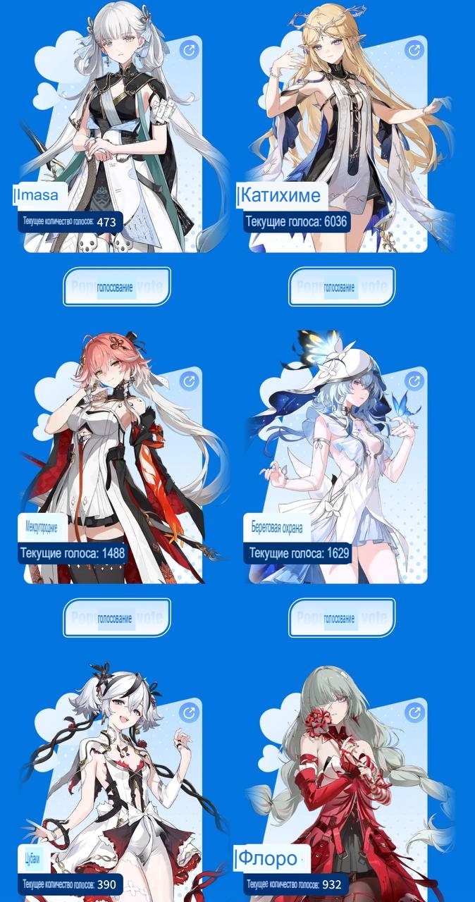 По голосовалке ксати, там помимо Картохи участвуют Цзиньси, Чанли, Шорка, Камелия и Фролова. Забавно, что нет ни Карлотты, ни Кантареллы с Зани и Фиби, и Лупой. Даже Янян отсутствует.