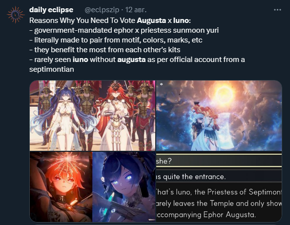 Не хотел крутить медузку но что то дамаг Фроловой с сигной и как она комфортно проносит контент подталкивает меня на то чтобы дать ей хоть одного сигнатурного тиммейта, как раз будет третья тима для башни. Ну а дальше фулл засол на Чису, Августа и Юно не особо нравятся, вот если бы ножки Юно нужны были ещё кому то кроме Августы и древних чемпиков.... заебала эта политика по распилу на саппортов.