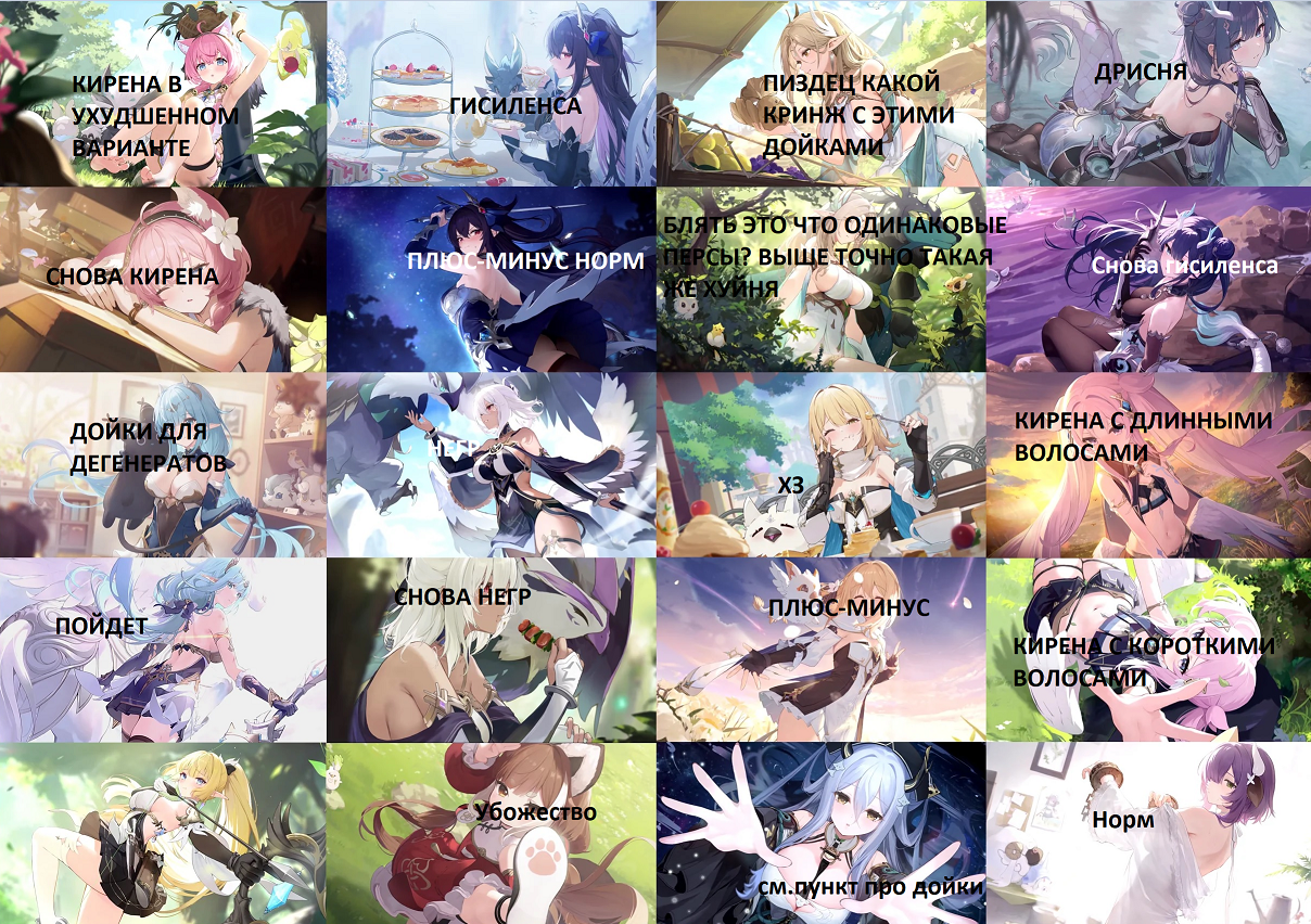 Я смотрю на эту пикчу и у меня абсолютно нулевое желание крутить кого то, а чтобы гача дрочильня завлекала надо хоть как то запариваться и делать оригинальные запоминающиеся дизайны, чтобы хотелось крутить этого чемпика Кумерство тоже надо уметь делать, эльфийки с вываливающимися жирными сиськами это говноедство, чтобы сделать персонажа сексуальным надо думать где и как что то подчеркнуть одеждой, а не просто хуйнуть пару нейротряпок на голое тело