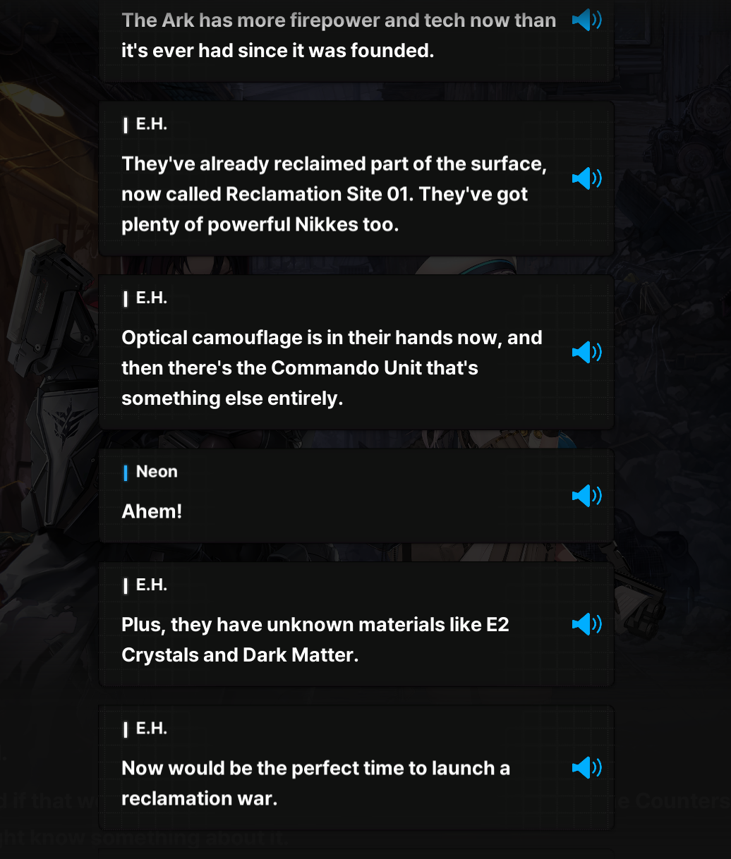 Буквально два лучших сквада оказались недостаточно сильны и прошли через какие-то улучшения, чтобы соответствовать новым угрозам, пару месяцев назад в арке просто пробили дыру и еретик вторгся, спиздил второго и съебался без проблем. Пилигрим с очевидно мутными намерениями сидит внутри арка и че-то делает. Дай бог квадратный километр земли, который еще ни разу не был атакован и не может быть использован как оборонная точка, так как нихуя не известно. Только только получили новую технологию, которую надо пиздец как исследовать, модифицировать под их оборудование и научиться воспроизводить и чинить, на это нужно куча времени и людей, обучать их всё такое. Буквально в ивенте нам показывают каких-то рапчуров-волков, про которые нихуя не известно, кроме того что они еще и своих ебашат. ХОть что-то известно только про 2-3х еретиков из 5 примерно, про королеву неизвестно нихуя. Сейчас вообще не время нахуй для третьей войны блять! Только только начали подвижки к исследованию вапауса блять, улучшите остальных никк, научите коммандеров реально сражаться, а не дохнуть как мух. Надеюсь это пример хорошей писанины, когда персонаж не имеет всего контекста и думает из своих ограниченных взглядов, а не тупой автор рассказывает нам сюжет через мысли рандомного мимокрока, у которого даже внешка не поменялась после перерождения в Никку.