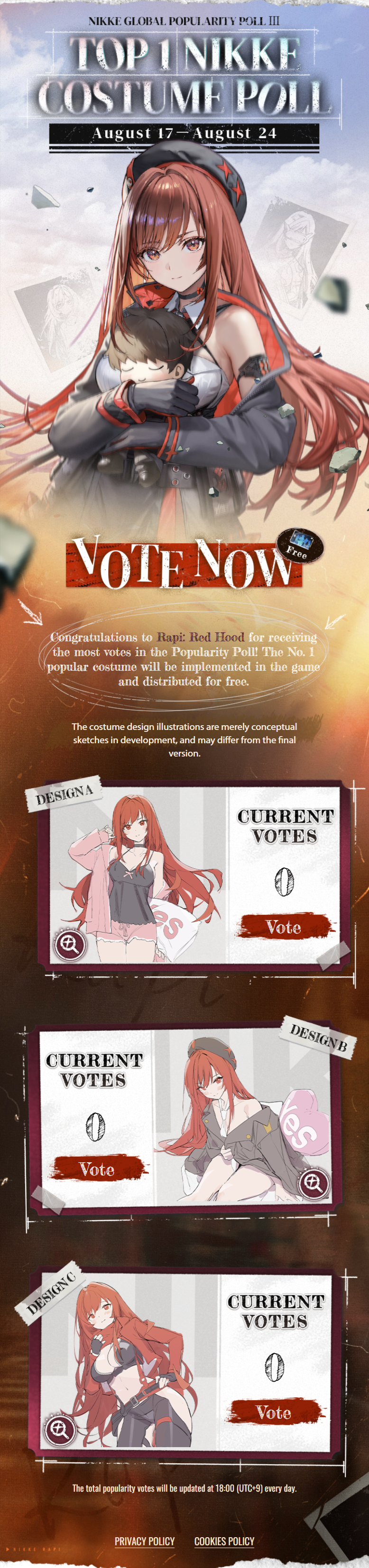 - Rapi: Red Hood Costume Design Voting This year, we will also release a free exclusive costume for Rapi: Red Hood, the winner of the 2.5th Anniversary Global Popularity Poll. We have prepared costume designs that you will surely like. While I have my personal favorite among the designs, just like last year, we will finalize the costume based on your votes. We have three designs for you to vote on beginning August 17, and we look forward to your active participation. I'll reveal the designs in advance through today's developer's note. Please take a close look and consider which design is most fitting. The design that gets the most votes will be released as a free costume mid-October. What we're doing is beyond just making and releasing designs; we will meticulously refine the details to make Rapi even more appealing in the game. May the joy and excitement we felt during the preparation be truly conveyed to all of you. Surface Content Development Progress Recently, we've concentrated much of our effort on developing the Surface content. In a previous developer's note, we've explained the general structure of the content, but in battles against Lord-Class Raptures, there must be a process that validates and enhances the tactical fun. Our goal is not simply to offer "another gameplay," but an engaging type of combat, even if it's not hardcore. With that in mind, we kindly ask for your understanding that we need more time to develop this content. Just like what's shown in the animation shared with the developer's note, in battles against Lord-Class Raptures in the Surface content, we need an evasive maneuver control that can identify the skill info of Raptures through surface effects and move the SD squad. However, battles in the Surface content only allow attacks between neighboring tiles for now, making it challenging to deliver a variety of patterns and tactical fun when dealing with Lord-Class Raptures. Therefore, we've introduced the range concept for both Raptures and Nikkes, implemented bullet-impermeable mechanics based on the terrain and structures, and added range-increasing skills to some Nikkes' Surface skills. Through these improvements, we aim to make the logic of Surface battles more engaging. Currently, we are separating the control experience of the main combat squad and the supporting squads in line with the introduction of the squad's range concept, building the data accordingly while also focusing on functional QA. Naturally, as the content is quite extensive, further adjustments and tweaks will be required after its release. But before then, our main focus will be on QA. We are aiming to release this content in October. With the remaining time we have now, we will do our best to ensure the highest level of quality and bring you a unique kind of fun.