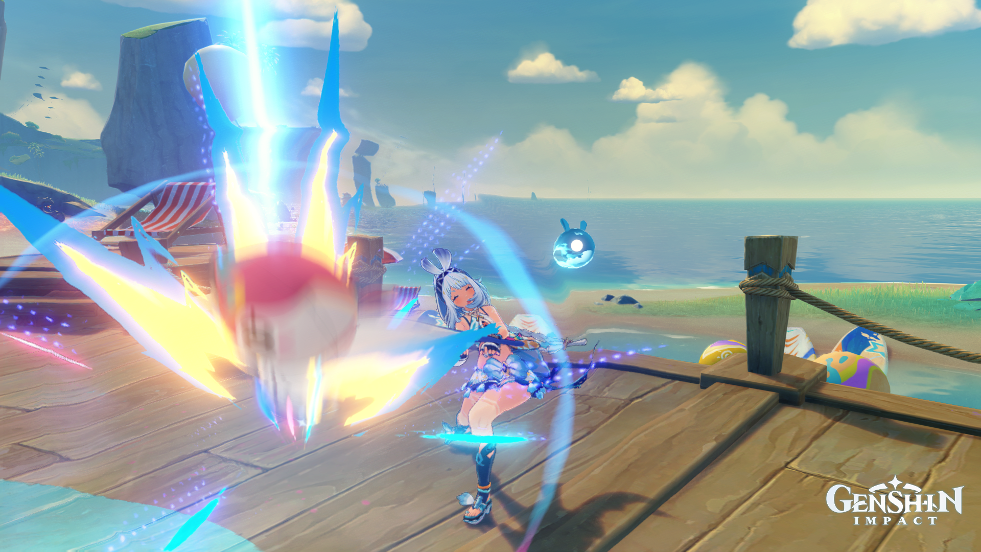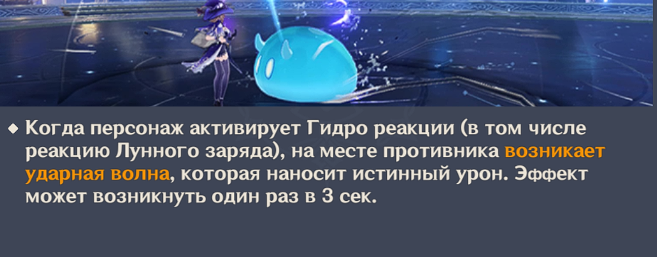 Когда персонаж активирует гидро реакцию (в том числе лунный пердеж, пердеж фальшивого неба, каэнрианский пердеж, селестианский пердеж, драконий пердеж, ведьмачий пердеж, безднопердеж, пердеж пролапса), на месте противника возникает ударная волна, которая наносит урон еоса. Раз в 3 секунды.