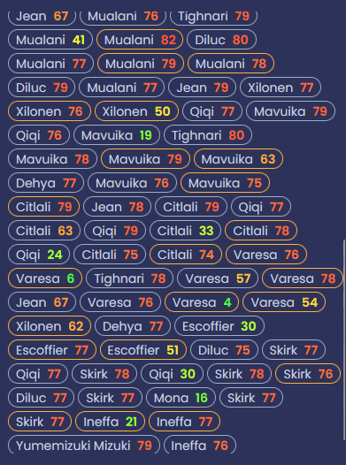 6.0 - 117 и 118 это персонажи из нового UGC режима, Лаума, Флинс и Айно - соответсвенно под номером 119, 120 и 121 6.1 - Нефер 122 6.2 - Линея четверка под номером 123 и Ягода 124 6.3 - Коломбина 125