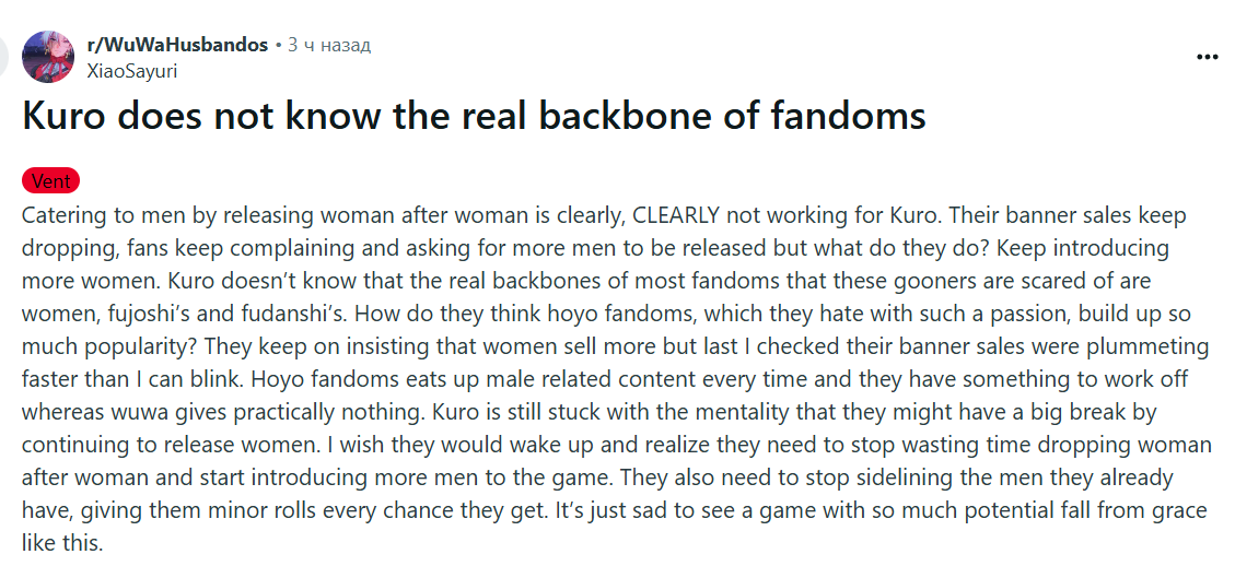 Угождать мужчинам, выпуская одну за другой женщин - явно, ЯВНО не работает для Куро. Продажи их баннеров падают, фанаты продолжают жаловаться и просят выпускать больше мужчин, но что они делают? Продолжают вводить всё больше женщин. Куро не знают, что настоящая основа большинства фандомов, которых боятся эти кумеры — это женщины.