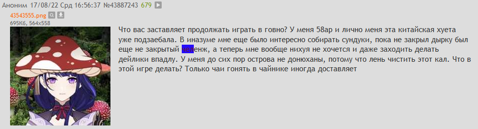Ну я возвращаюсь, получается. Когда нет постоянной игры, в которую можно вернутся, и все вокруг говорят про гачаслоп, особого выбора считай что нет. Буду тогда уж в самый медийный и плюс-минус похожий на игру продукт играть, раз такое дело. Я так понимаю, всё уже крипнуто сто раз, и ганю с хушкой больше не канают? Есть аккаунт с фуриной и открытой до зумы картой, Богиня-то хоть жива ещё?
