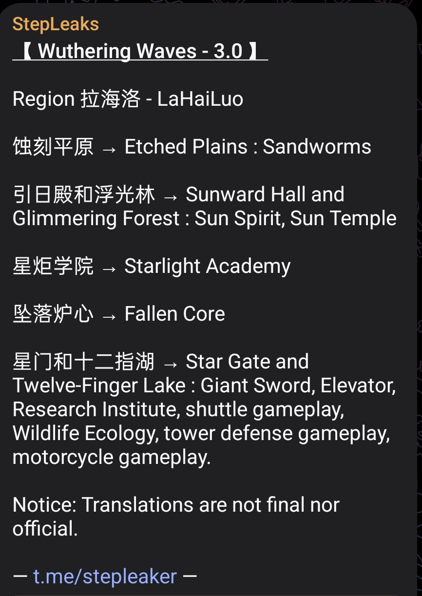 ·Weekly Boss materials conversion ·Dorm ·Add room with damage testing dummy ·Add an ability to select a character voice language acting for every character ·Add pulls counter on convene menu ·More language localizations ·Add a function to view details of friends' characters ·Add opportunity to choose region for daily quests ·Increase reward claim attempts for weekly bosses ·Opportunity to fail QTE events ·Add ability to disable resonanse chains on characters ·Remove pop-up message in Tower of Adversity after restart ·Priority for leveling up talents for resonators ·Make it possible to track several types of echo on the world map, not just one ·More difficult endgame content ·More slots for echo presets