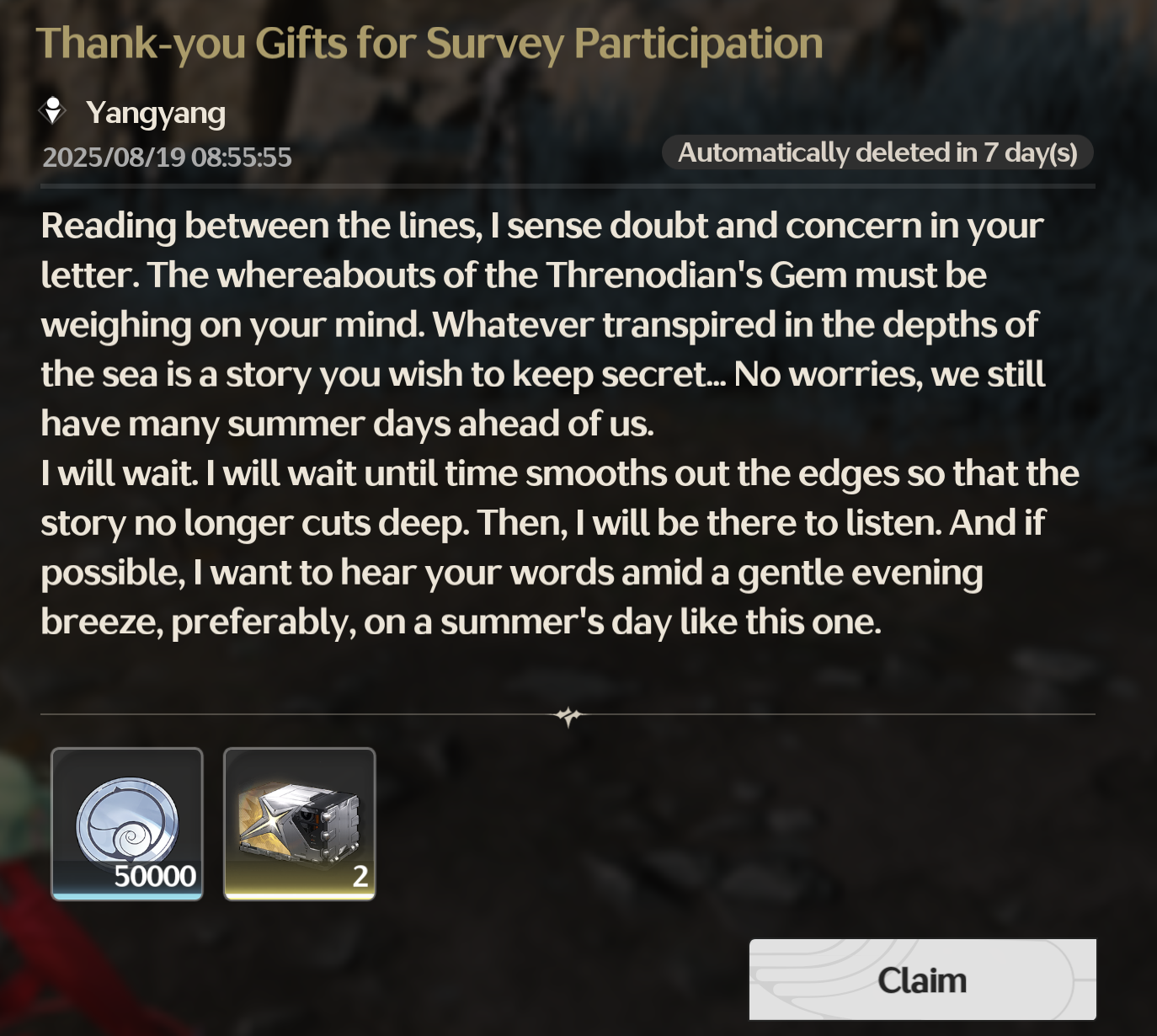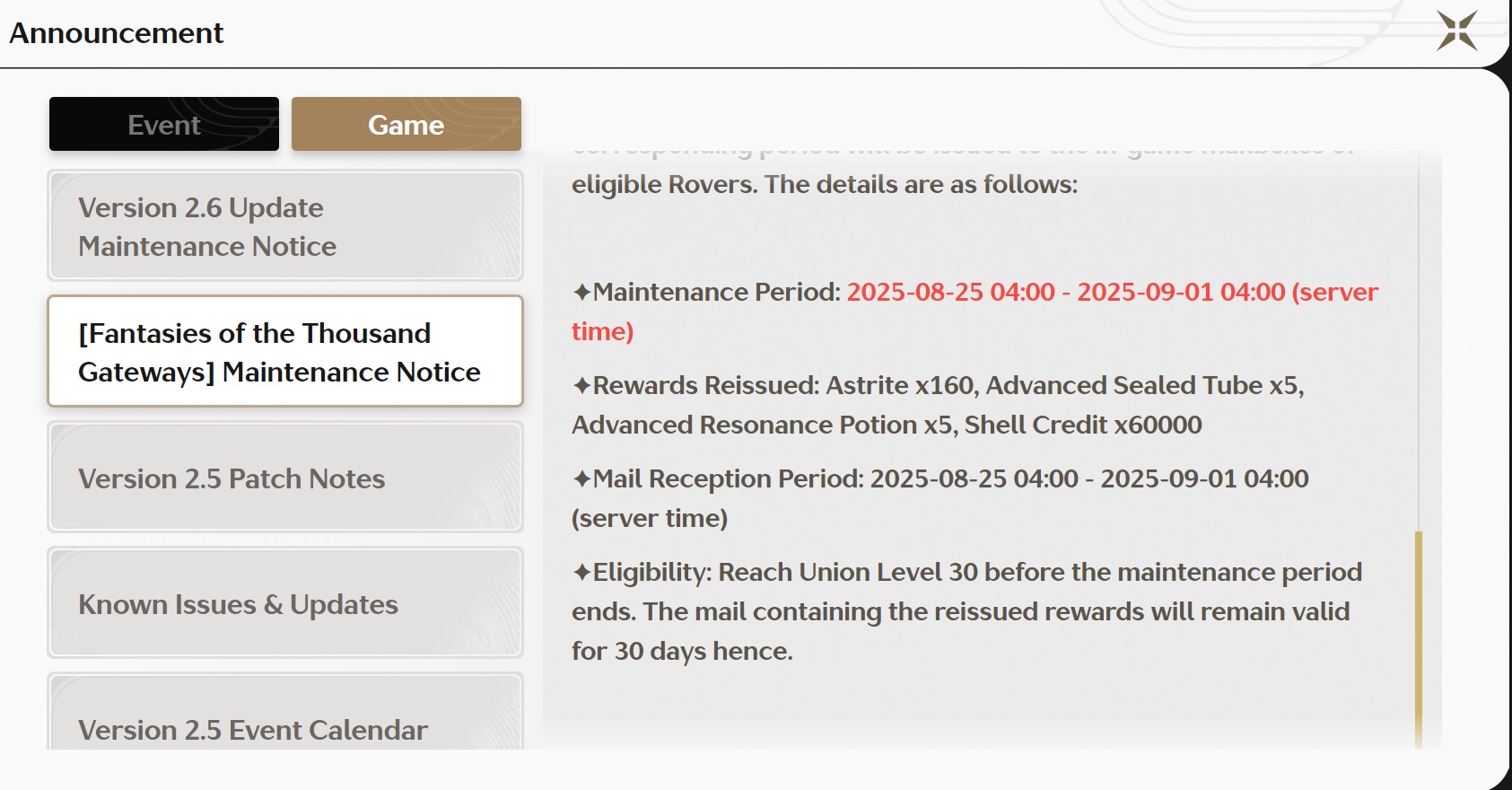 · Weekly Boss materials conversion · Add room with damage testing dummy · Add pulls counter on convene menu · Add more language localizations · Add a function to view details of friends' characters · Increase amount of tuner rewards in "Tacet Fields" and "Fantasies of the Thousand Gateways" on UL 60, UL 70 and UL 80 · Add a separate activity that allows you to spend waveplates ONLY for tuners · Add opportunity to choose region for daily quests · Make Kurobbs available for global · Increase limit for friends · Increase reward claim attempts for weekly bosses · Ability to farm echo on weekly challenge bosses in co-op · Add option to turn off/on resonanse chains on characters · Remove pop-up message in Tower of Adversity after restart · Priority for leveling up talents for resonators, based on in-game player statistics · Ability to revert purification in synthesis menu · Ability to track several types of echo on the world map, not just one · More slots for echo presets · Add endless combat endgame mode · Add more co-op events · Increase daily limit of TDs in Nightmare Nests · Add Tacet Field with Nightmare Tacet Discords · Remove unobtainable sigils from 1.0 version · Add all new Ascension Materials in merchant stores · Add archive of records in ToA · Add friends records in ToA and WhiWa · Do not update Dreaming Deep or fully rework them · Add more Previous Records for Infinite Feats, not only last reset · Fix "Guide Depot", it contains a lot of misleading information · Link echo presets to team presets · Fix bug in WhiWa where you cannot change resonator weapons and echoes after quitting from stage · Increase echo limit in Backpack
