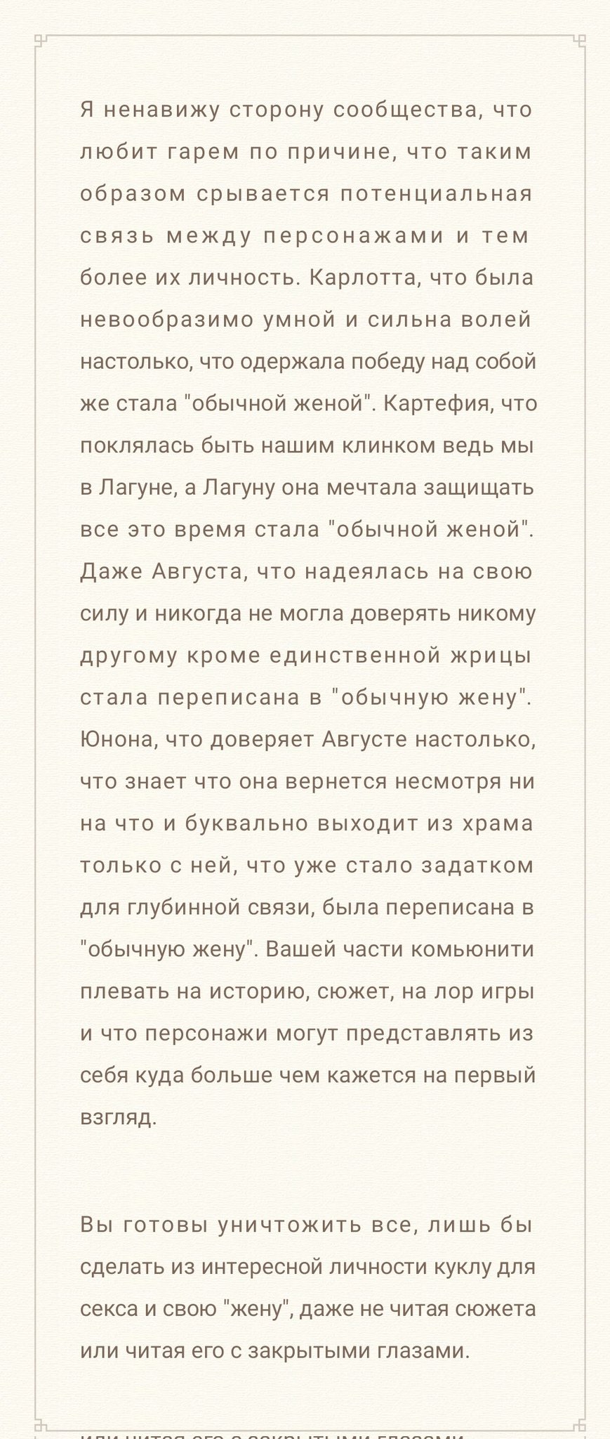 >>5433102 Я тоже жутко разочарована в сюжете. Начинала играть в WuWa ещё на релизе — ждала жёсткую постапокалиптическую историю, как и обещали в рекламе. А в итоге это превратилось в коллекционер вайфу, где у всех девушек харизма как у доски 😭 Я сама девушка, и мне нравятся хорошо прописанные женские персонажи в играх, но то, как WuWa их подаёт — это просто мимо. Да, местами красиво, синематики впечатляют, но до настоящего хорошего сюжета там далеко. Сейчас я уже почти забила — захожу по инерции, чисто ради самурая, которого тизерили. Но когда совсем отпустит — просто перестану заходить, и всё 🤷♀️🤦♀️
