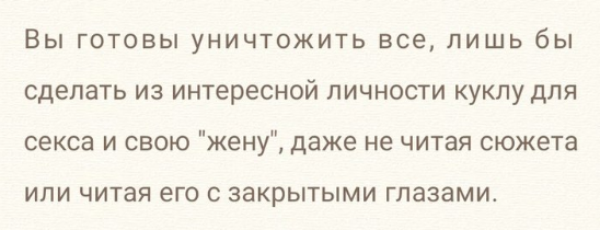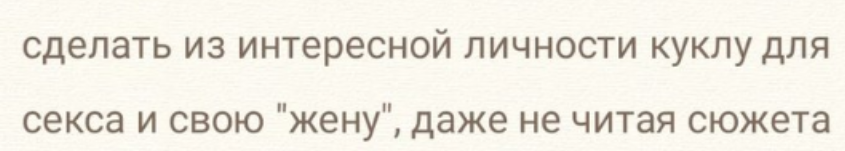 >>5433102 >вы готовы уничтожить всё. лишь бы сделать из интересной личности куклы для секса и свою "жену", даже не читая сюжет или читая его с закрытыми глазами Ой ли, правда? Это случаем не одна из тех, кто пропустила весь контекст сюжета Фроловы и форсит её ненависть, даже не читая сюжет? Буквально отказывая персонажу в глубине.