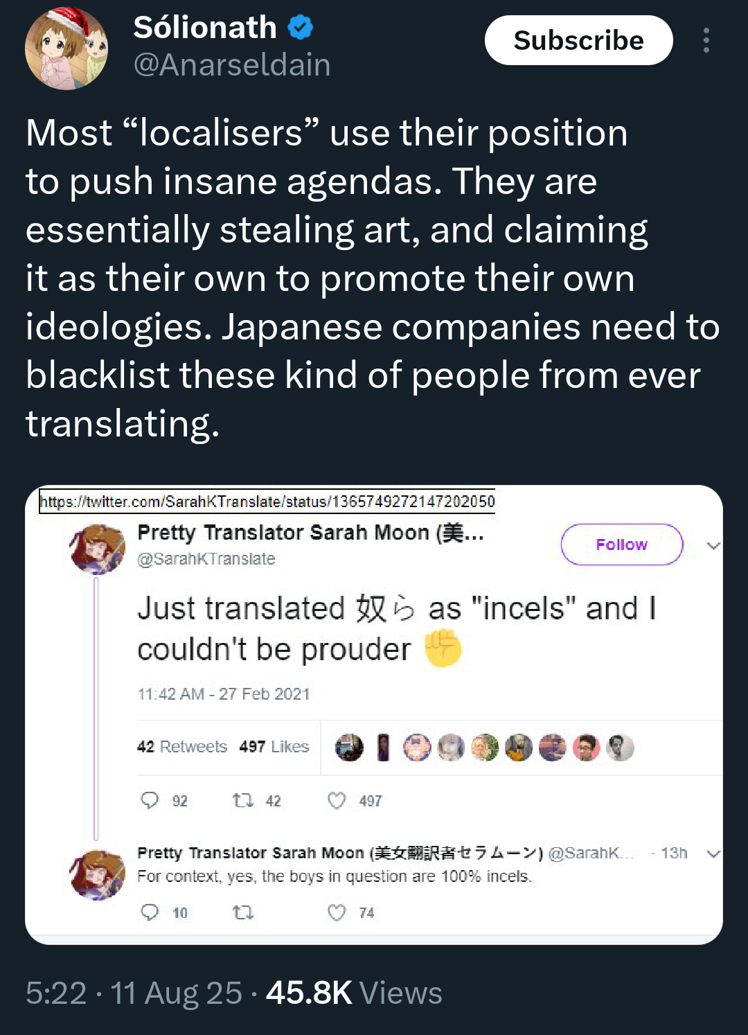 >>5434365 Проблема англа в том что там сидят соевые падисары с самомнением что они-то лучше знают как писать и делать, куда уж там азиатам ебучим до их прогрессивных идей. И поэтому они чаще и борзее хуй кладут на корректность переводов и озвучки.