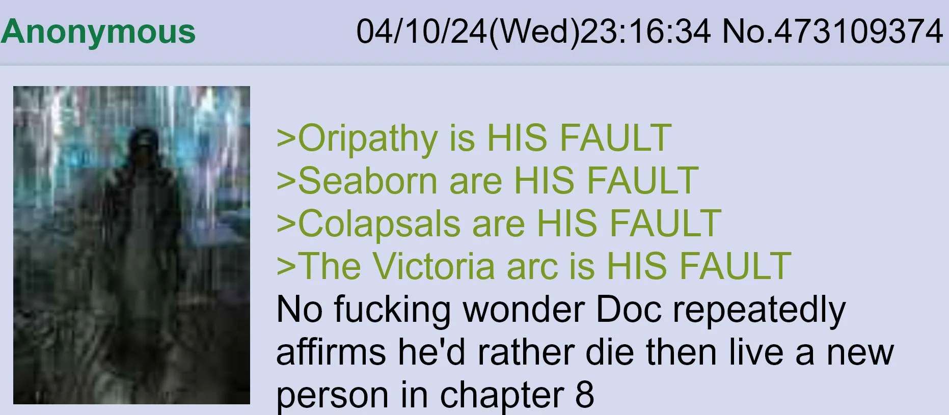 >>5443096 Да прост прошлая версия Дохты убила Терезу, но та вроде как успела промыть ему мозги перед тем как сдохнуть. И Кальцит как бы предполагает, что дохта нихуя не помнит о прошлом. А тут оказывает, что как бы не помнит, но о самом главном пиздеце и источнике всего зла в мире, что более страшное чем демонлорд, что-то начинает вспоминать.