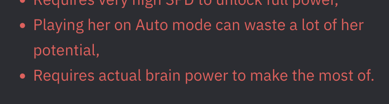 >>5435491 >Мне нравится Мидей, просто констатация факта что ему нет места в игре. Вот сейм. Его словно нарочно порезали дав антисинергию с гиациной, чтобы оставалась ровно 1 метавая опция в сабдд Кастории, это даже при том что он дизайнился чисто под неё. По итогу вместо гармоничной команды где каждый элемент навыков персонажей между собой перекликается получился адовый костыль, только и только потому что Гиацина не способна выхилить 1 чарика с кучей ХП, как например могут Хохо или Галлахер.