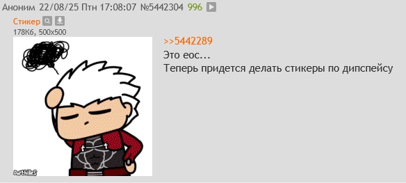 >>5444160 Я про убв. Где Тосака его призвала и он ведёт себя с ней как батхертнутый мудак. Хотя по факту ему стоило просто запросить у нее зарядку маной.