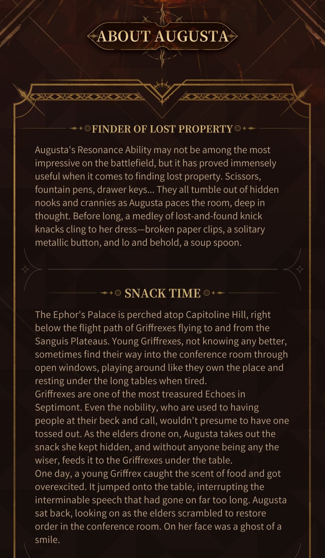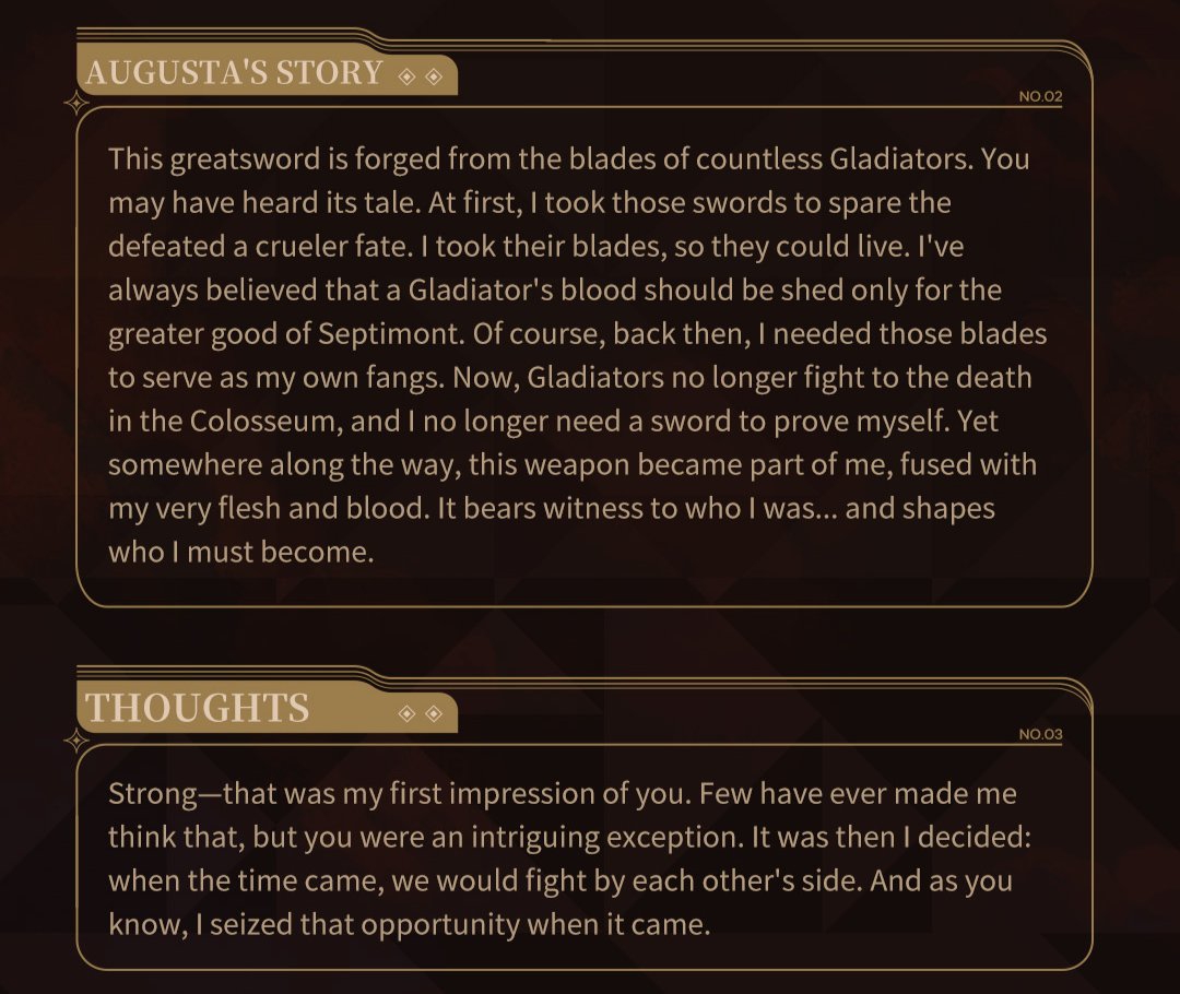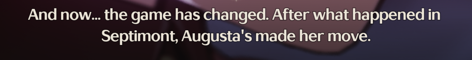 Я Августа, Эфор Септимонта. Запомни это имя — оно принадлежит той, кто возвышается над всеми, и чей след никогда не сотрется. Враги мы или союзники, мой меч и я жаждем яростного боя с тобой!