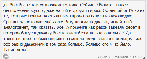 Вообще хуею с этих "новичков", тут стабильно раз в два патча вальку с фуллгиром гарантированно получаешь, а они ебало воротят. А крынь за сюжетку на актуальную фулл пачку хватит. Ну, на фулл наверное всё таки не хватит, но на 2 из 3 будет достаточно, а 3 затычку на первое время воткнуть