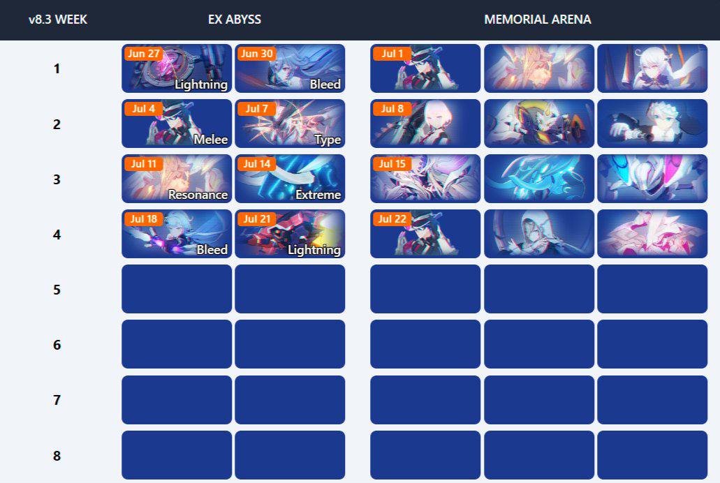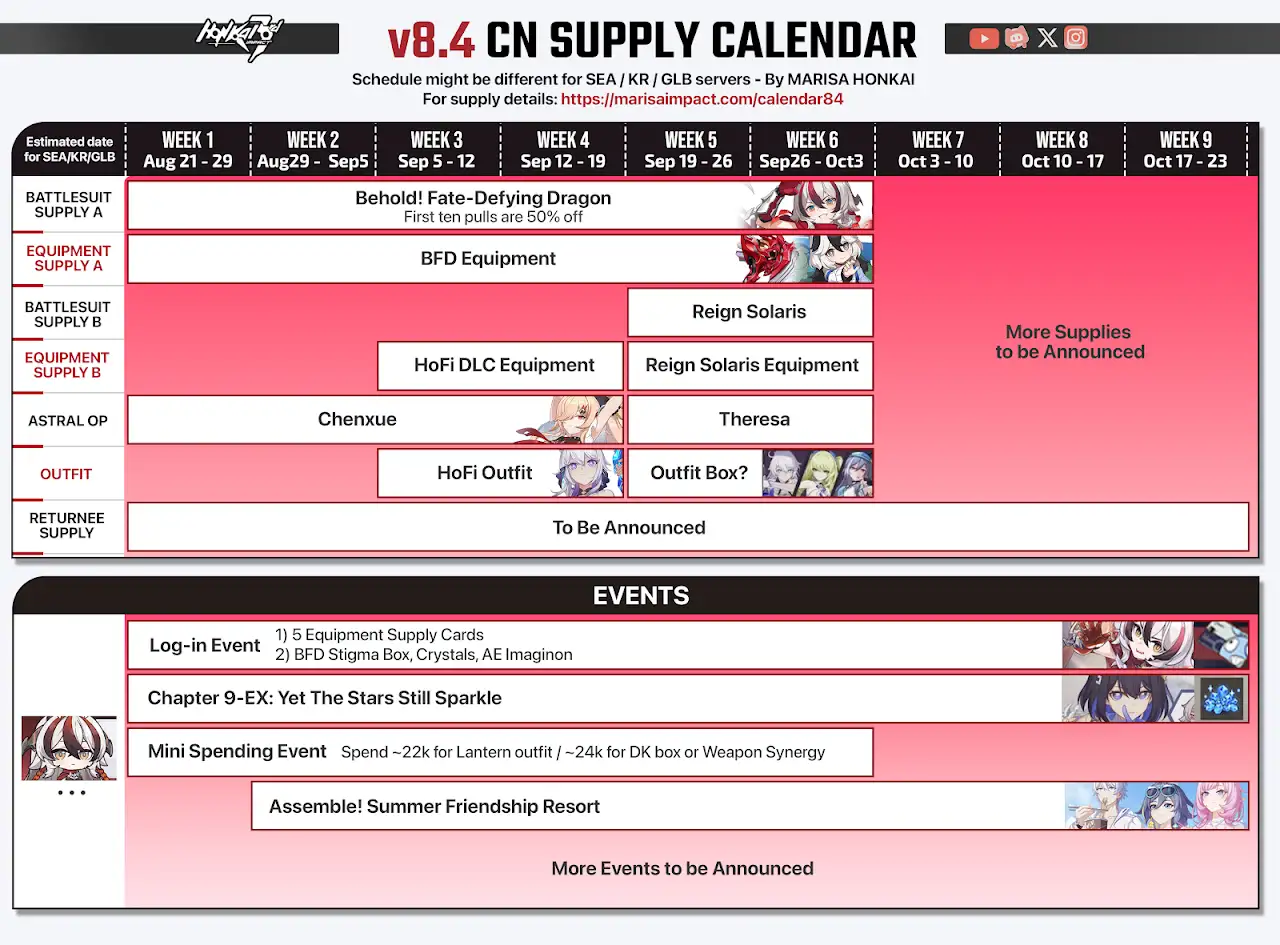 Учитывая оставшееся количество дней для БП версий 8.3 и 8.2 выходит следующая ситуация: - 8.3 начинается на Китае 29 мая, на Глобале 26 июня | продлится 8 / 9 недель - 8.4 начинается на Китае 24 / 31 июля, на Глобале 21 или 28 августа | продлится 8 / 9 недель - 8.5 начинается на Китае 25 сентября, на Глобале 23 октября | продлится 10 недель - 8.6 начинается на Китае 4 декабря, на Глобале 1 января *В сумме 8.3 и 8.4 длятся 17 недель, однако дата выхода 8.4 неизвестна, потому и длительность обоих патчей пока не совсем ясна
