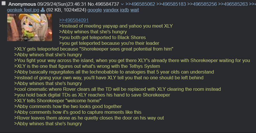 >>4936378 Самый пиздец в том что геншин он блять весь ПРО НЕПИСЕЙ. И так оно везде, любой квест перса это история нпс в которой просто участвует игровой персонаж. Вот сейчас квест Эскуфье, в нем она на третьем плане, нам просто рассказывают ахуенные истории рандомных неписей из фонтейна с плоскими модельками, квест если что длится 5 часов. При этом ключевым лорным персам типа Капитано в игре внимание не уделяется вообще, его история это флешбек на 1 минуту. В следующем патче будет Скирк, ключевой лорный перс, но ее квест будет про какого-нибудь нпс из каенриах.