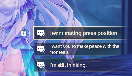 >>4937641 >Попался? Одной-единственной юшкой в интимаси? Так якобы безюшковые Джинса и Феня их там раздают куда чаще и куда менее витиевато. Для Зани Ровер просто привнес изменение в ее строгий распорядок жизни. Для Джинсы Ровер это родственная душа, позже очевидно возлюбленный (As I get to know you better, I can't help but notice the similarities between us. Our frequencies, powers, and even purposes seem to align... I once believed that mankind should control our own destiny, but my meeting with you has shown me the power of fate. I am grateful for its hand in bringing you into my life; Could it be that you also share a mysterious connection with our Sentinel? I do hope so, as that would make me feel… even closer to you...), для Фени - возлюбленный сразу же (The feather I gave you before? Well, it was forged from the fires of my heart. There are only two of them... As long as my flames still burn, I will stay by your side, dear Rover.)