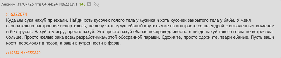 Во всех гача-дрочильнях одно и то же, селедки вкатываются в игры которые созданы не для них и пытаются навязывать свои вкусы и что-то требовать Зюзя со стался нас встречает гяру Николь и аутисткой Энби с огромными сочными ляхами, какие нахуй сосиски, они ебанутые? Это буквально если мы всем тредом начнем вкатываться в ЛАДС и триггерится, что там тяночек голых нет