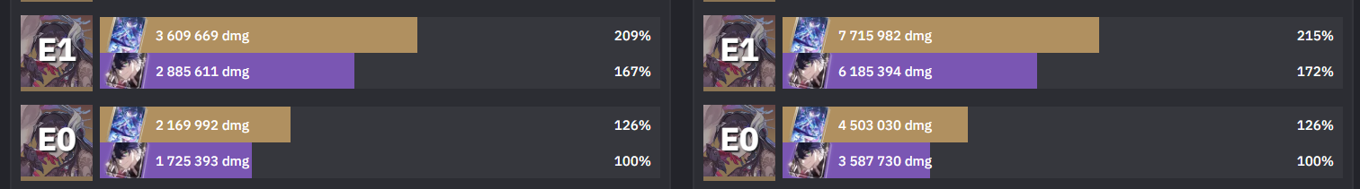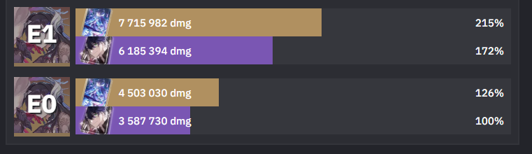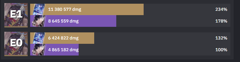Ща глянул сравнение Е0 с Е1. Пиздец, это небо и земля. Походу на Е0 просто 0 смысла оставлять чара. Забрать сейчас ей Е1, это как добрать ещё одного полноценного дот-тиммейта в пачку не занимая сам слот.