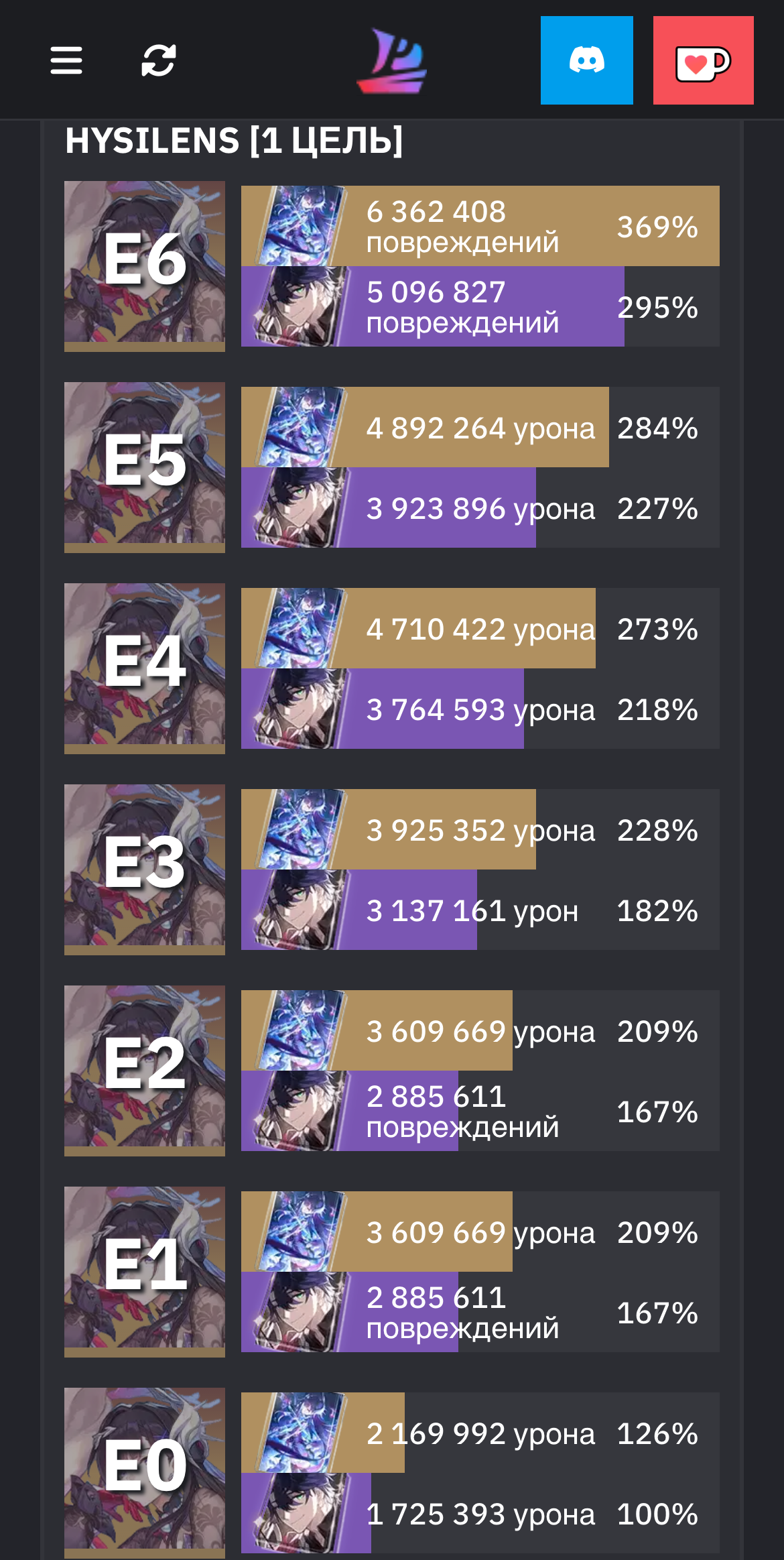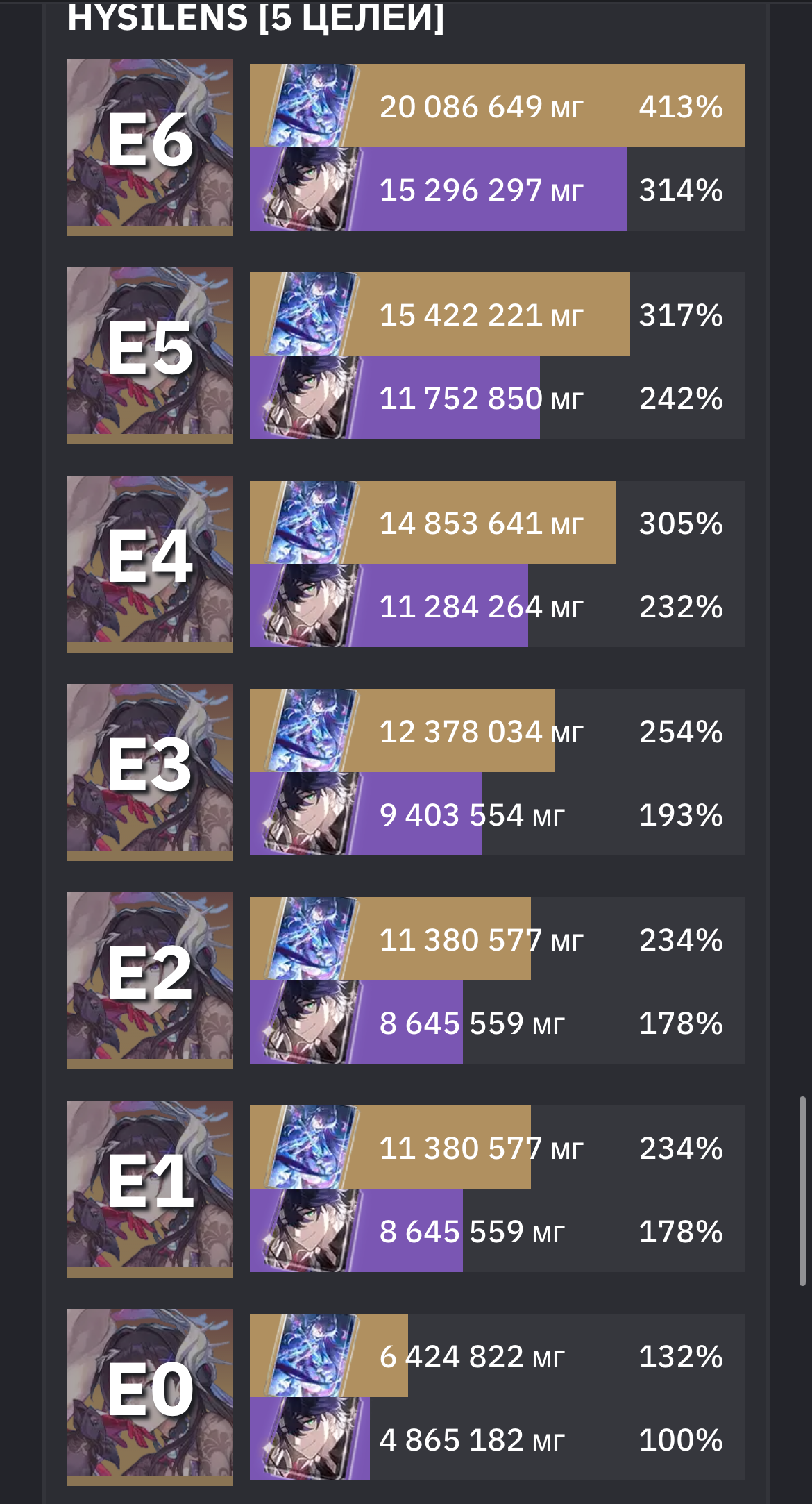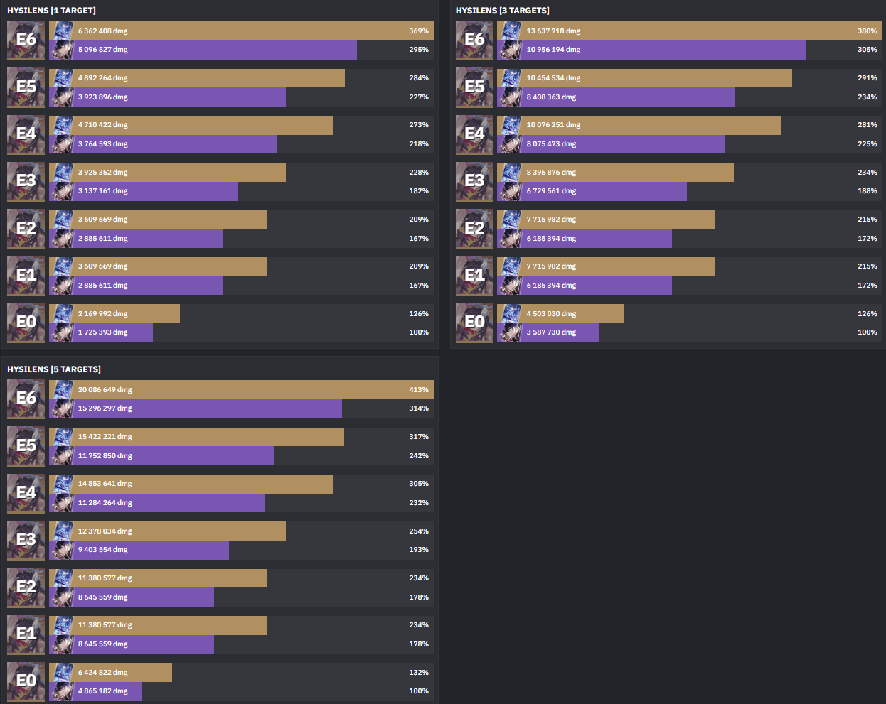 У Гисиленсы прирост урона на е1 и е6 почти одинаковый кроме 5 таргетов(70-75% прирост урона),на ранних бетах нынешний е1 был вроде на е4 или е6,а у е6 был другой эффект,но в последних версиях его вставили в е1.