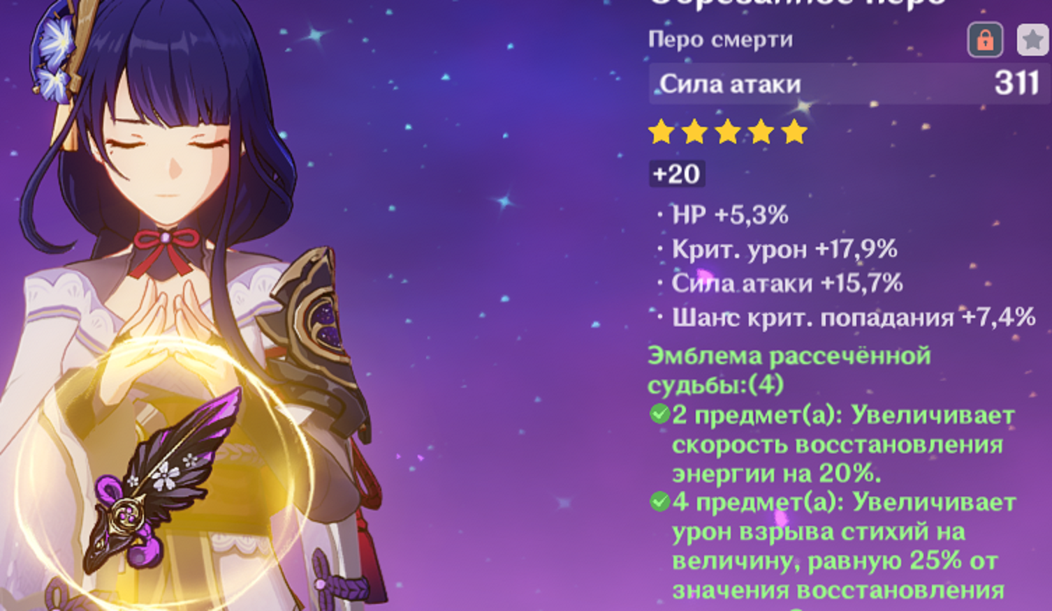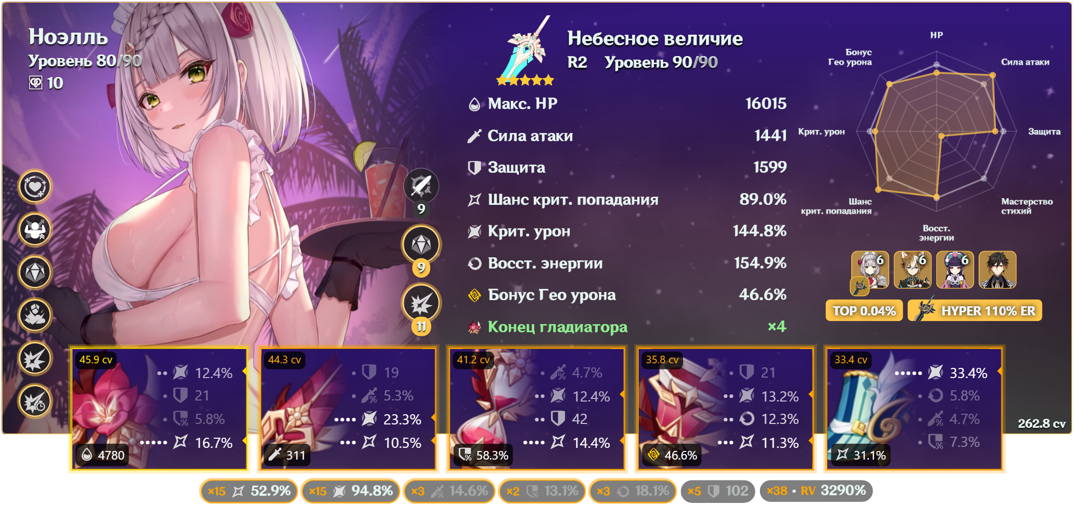 Ну и арты у тебя вполне норм. Оружка говно конечно, но сойдёт, если сигну не хочешь крутить. Возможно, у тебя есть сигна чулочника или аква? Это топ 2 и 3 оружки на неё.