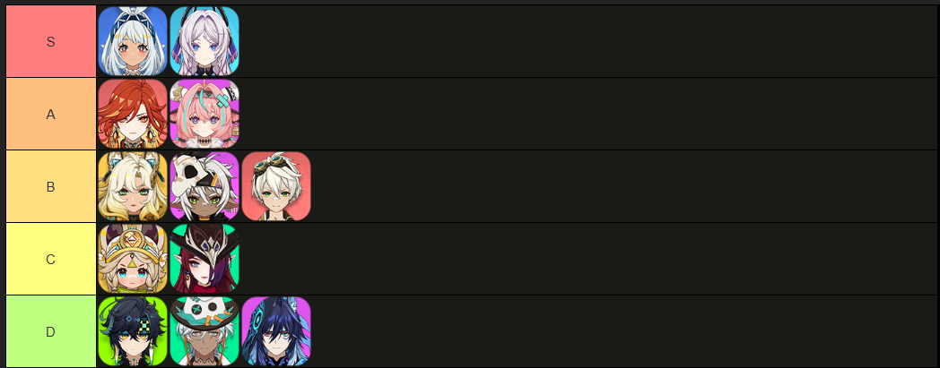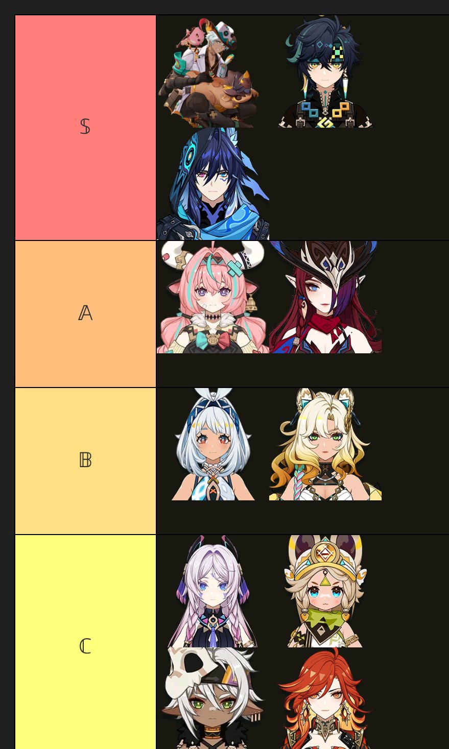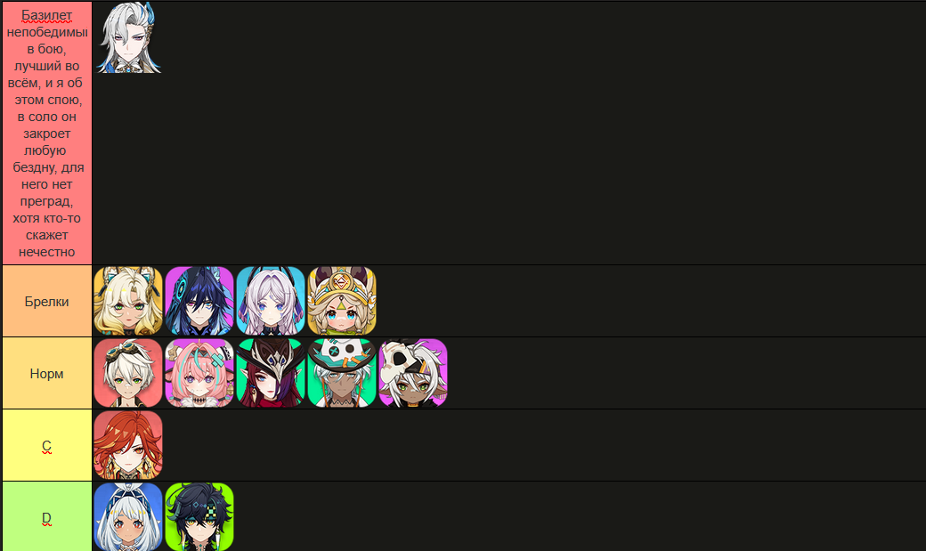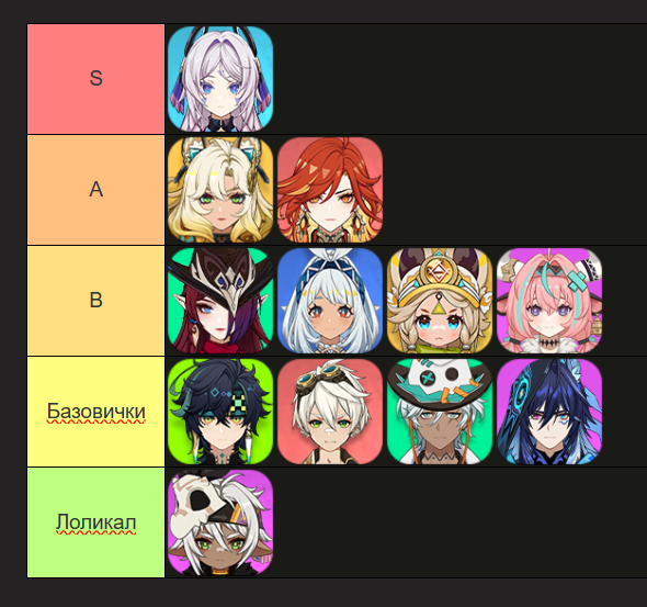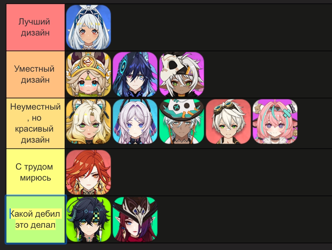 Раз тредик умер, а Натлан кончился, то предлагаю сделать свои тир листы по Внешке и Характеру вышедших персонажей! Сразу предлагаю шаблончик: Первые три жестких места только самые любимые вайфы, далее уже кучкуй по интересу Можно составить тут: https://tiermaker.com/create/genshin-natlan-characters-16104089