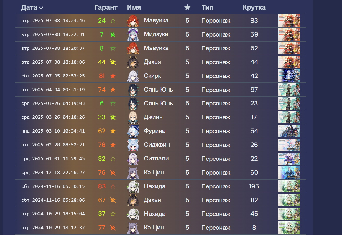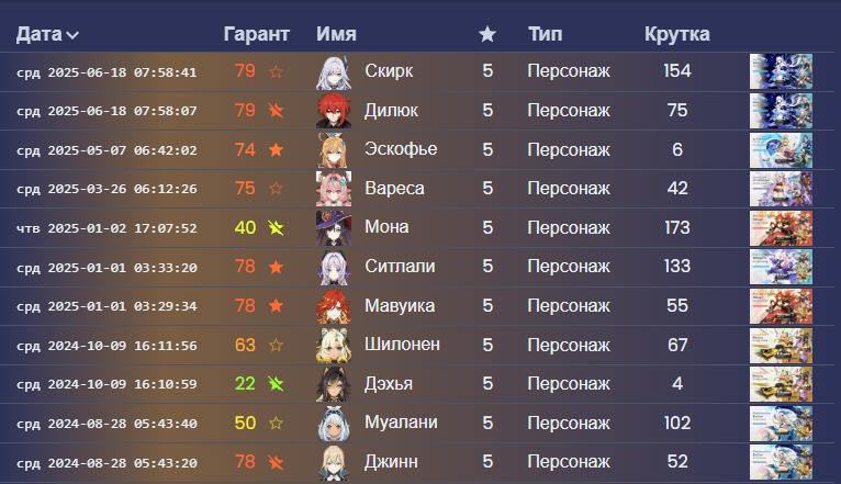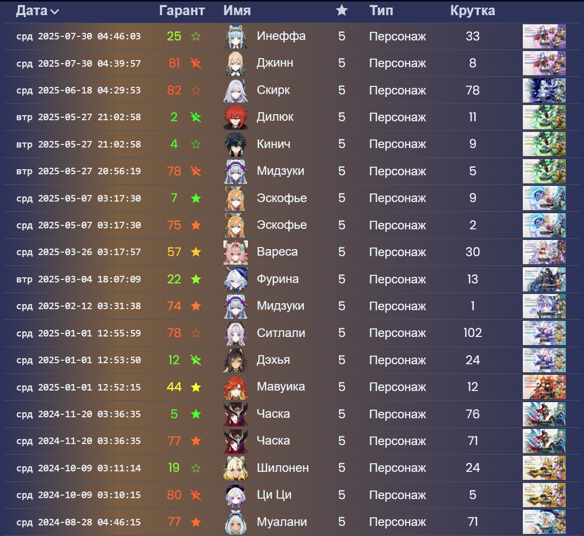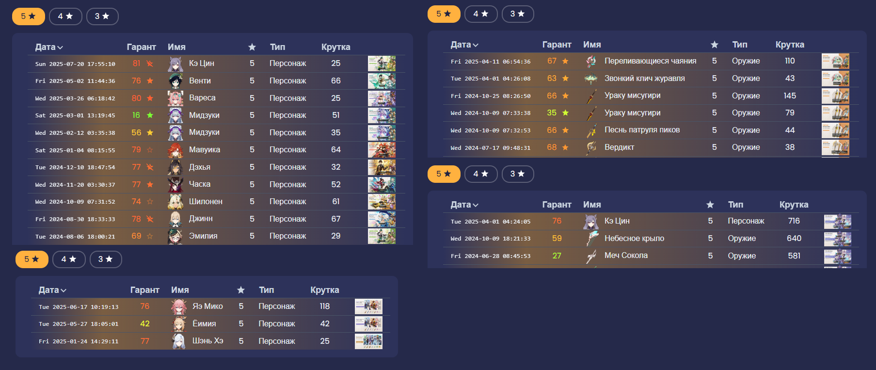 >>5461922 899 круток за весь Натлан, получены все лимитки, 19 пятизвездных персонажей, получается по 47.3 крутки в среднем, 10 уникальных лимиток + 1 стандарт (Мидзуки), получается 81.7 за каждое пополнение коллеции (без учета конст и других пятерок). Вроде хорошо. В Фонтейне было ощутимо хуже.