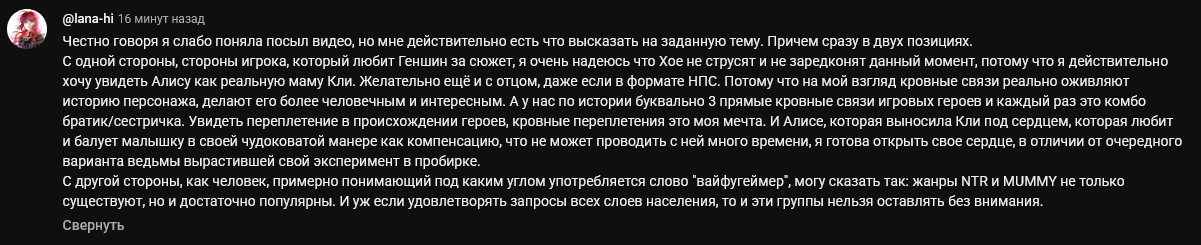 Просто читал уже посты, что для кого-то Геншин - это буквально единственная отрада. Лично вот у меня, хоть я на удивление за пару лет игры, но прикипел к Геншу, даже времени провёл наверное больше, чем во всех остальных играх вместе взятых, но всё же вижу жизнь без Геншина. Грустно будет, конечно, но не так, чтобы совсем в упадничество. А у вас как?