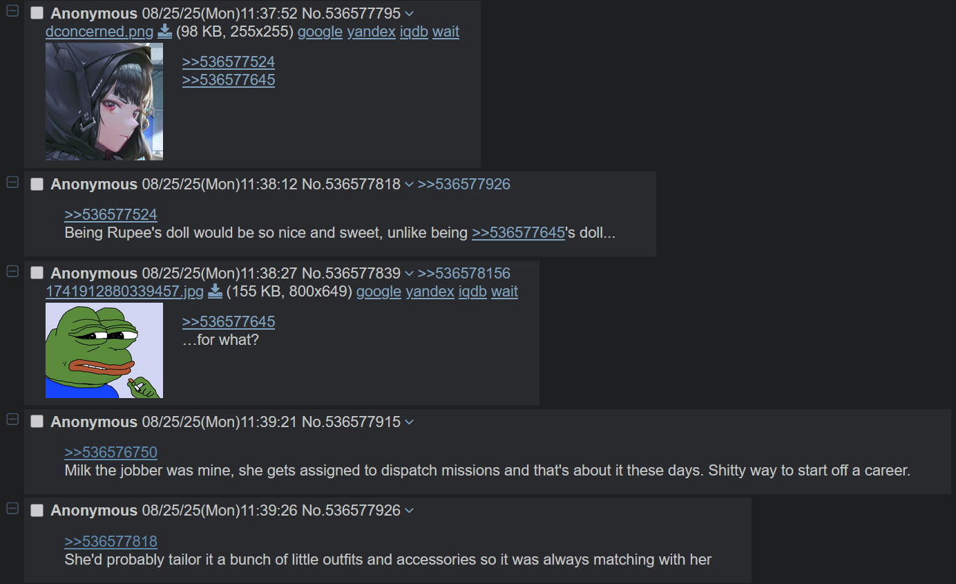 >>5458431 Limit Break в основном. >>5458415 Долбоёб тут только ты. С геймплейной точки зрения может и поебать - купил кольца и выдал хоть всем. А с лорной точки зрения - CG придёт отчёт, что за неделю 100+ никкe заключили условный брачный договор с командиром спецотряда и получили от него кольца. И среди них не только всякая шваль вроде Exotic, Protocol и Cooking Oil, но и Counters, Aegis, Unlimited и даже Absolute с Matis. Одно дело что Андерсон тебя сплавил из Арка на Аутпост - то был эксперимент, плюс он был им и Ингрид обоснован, а CG одобрен - это уже выглядит как попытка переворота.