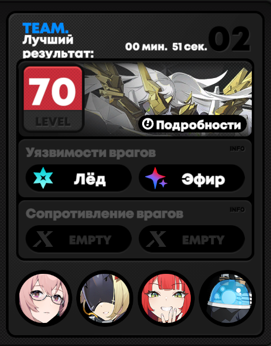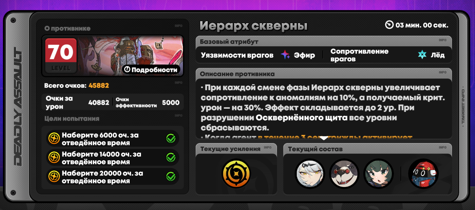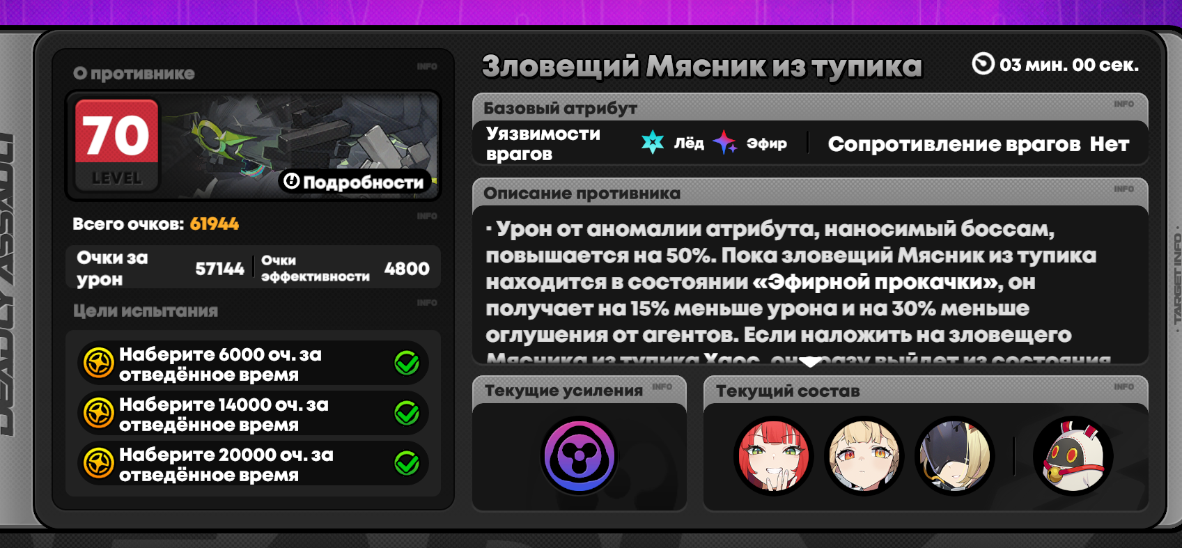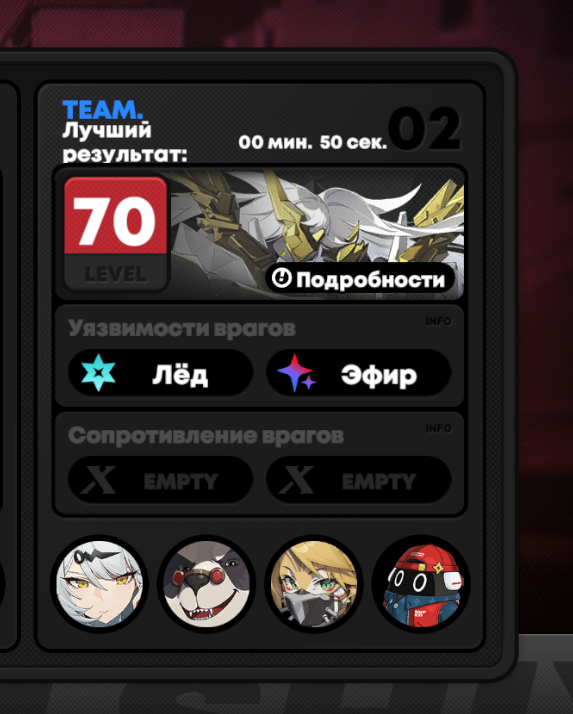 Сопротивление новых боссов Еженедельный босс: -20% к сопротивлению эфиру, 40% к физическому сопротивлению, неуязвим к заморозке, 32% максимальной аномалии, 100 базовой защиты Новый босс: -20% к сопротивлению льду, 20% к сопротивлению электричеству, неуязвим к заморозке, 32% максимальной аномалии, 100 базовой защиты