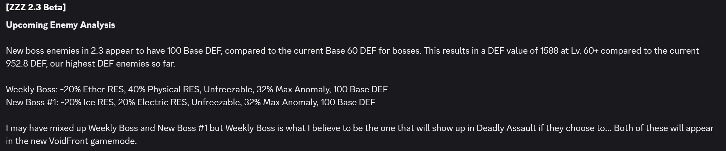 Upcoming Enemy Analysis New boss enemies in 2.3 appear to have 100 Base DEF, compared to the current Base 60 DEF for bosses. This results in a DEF value of 1588 at Lv. 60+ compared to the current 952.8 DEF, our highest DEF enemies so far.