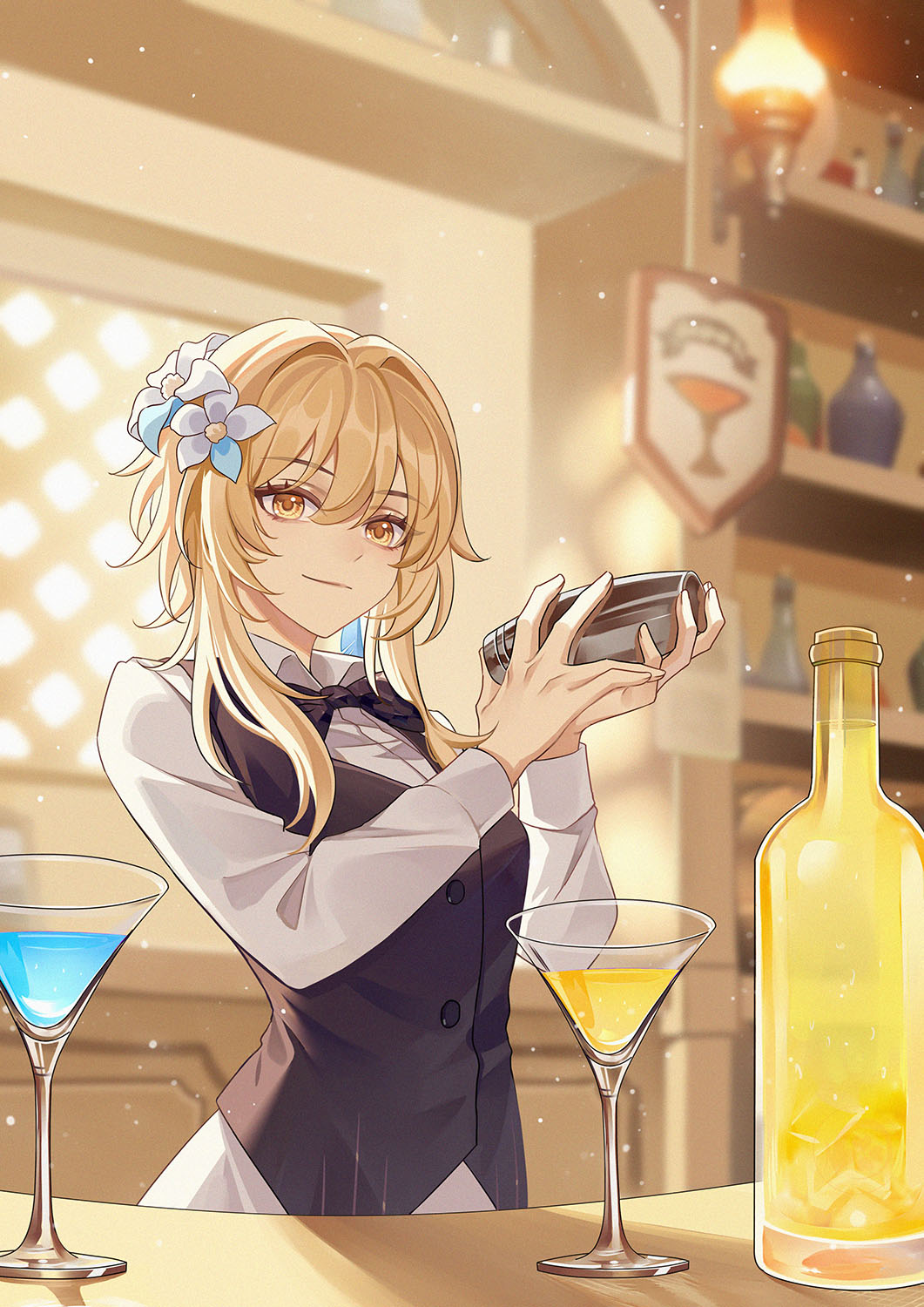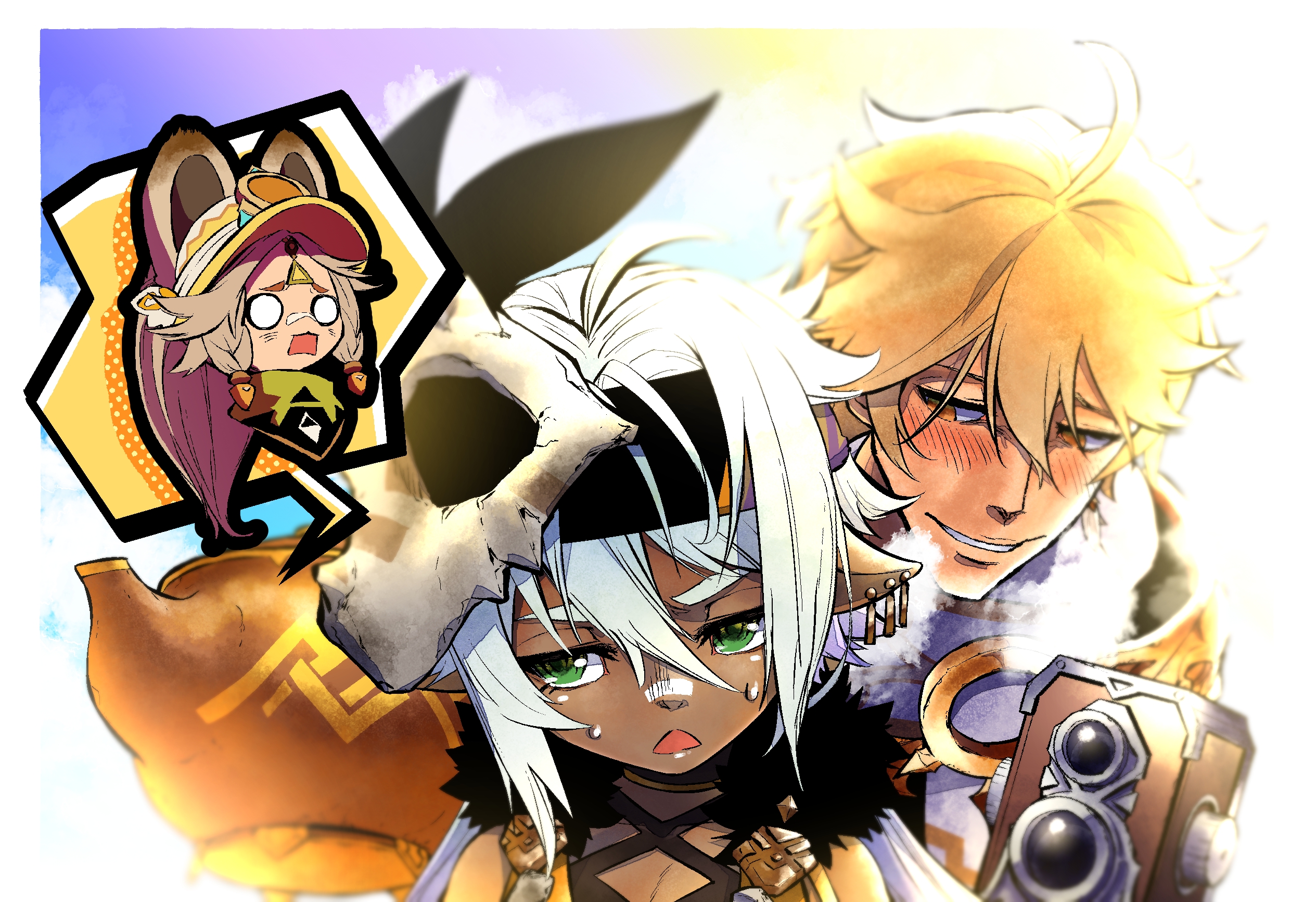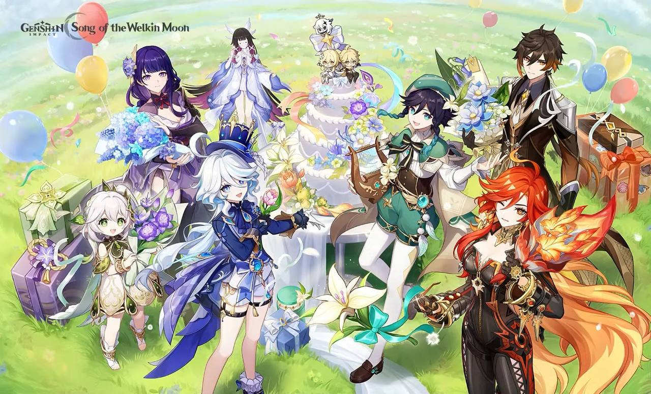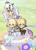 Напоминаю, что арт к годовщине посвящен свадьбе Светки и Чмони. Свадебный торт на месте. Архонты похдравляют счастливую пару не из Тейвата букетами и подарками