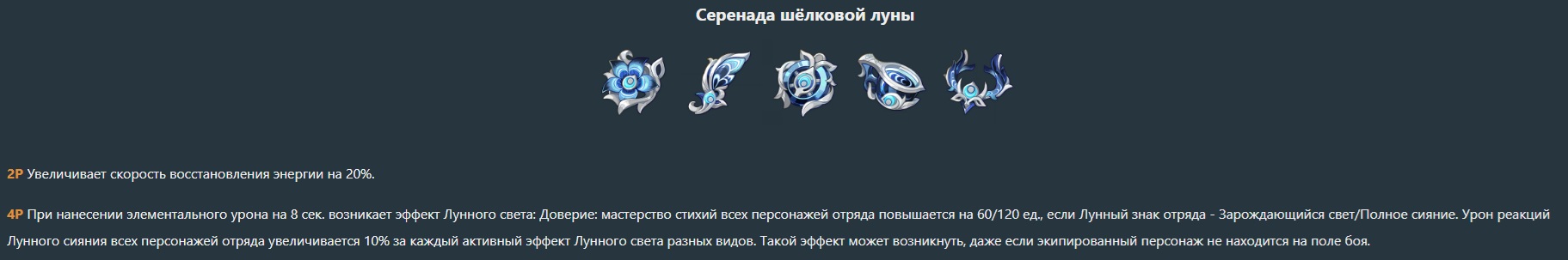 Какой сет артов на Лауму вообще выбивать надо будет? Из новых? Который серенада? Там что-то про лунное сияние написано. Что это за хуйня вообще? Лунный свет ясно, баф в зависимости от кол-ва Нодкраевых чаров в пати. Лунная бутонизация у Лаумы тоже ясно, чисто реакция бутонов если она в пати, а так же одна тычка при нажатии Е. Лунные заряд у пылесоса понятно. А что блять за лунное сияние?