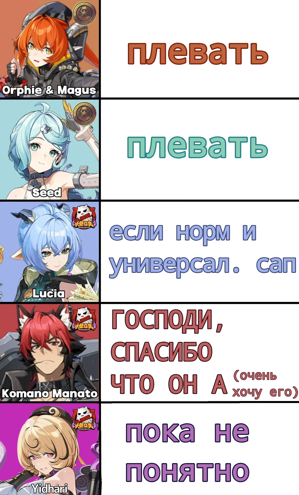 >>5503083 >Какие баннеры дальнейшие и что стоит крутить? Самых лучших агентов таких как Мияби, Исюань, Астра, Юзуха ты пропустил, они совсем недавно были. Рераны нескоро. Так что крути по вайфуфактору пока что или скипай. Если б у тебя не было Янаги с сигной, лучшим вариком была бы Сид, она в бюджетных пачках очень сильна. Но под электроуяз у тебя хороший перс уже есть. А так гашетка с сигной супер, в любую пачку затычка. Ева и Орфея неплохие дамагеры, но им нужны Астра+станеры Лайтер, Фуфу, Гашетка, в крайнем случае Люси+Коляда, но у тебя её нет, видимо. В 2.3 можешь забрать козу+осьминога, это сильная связка.