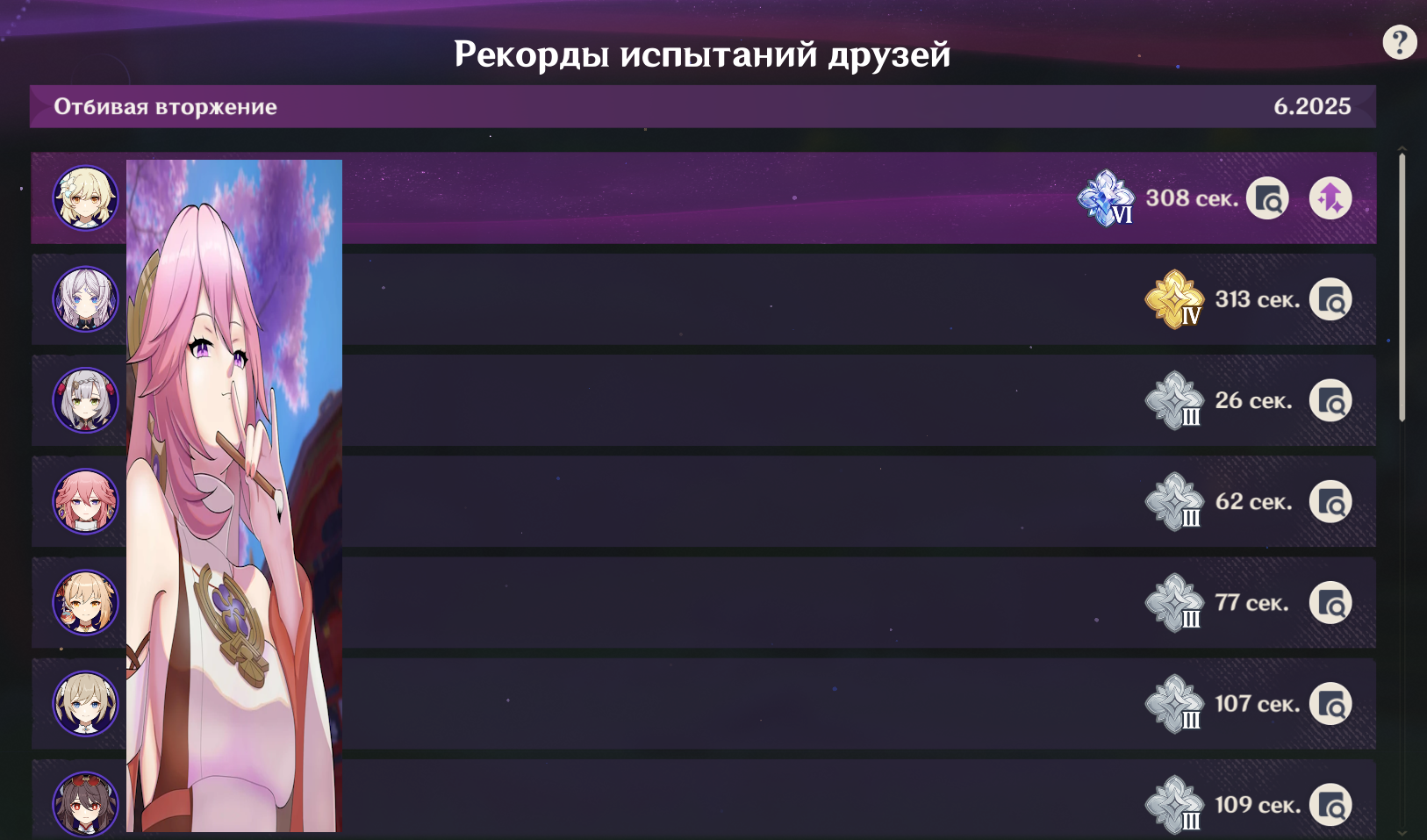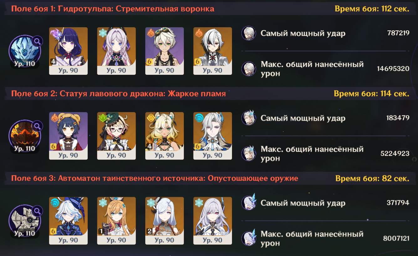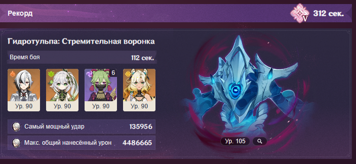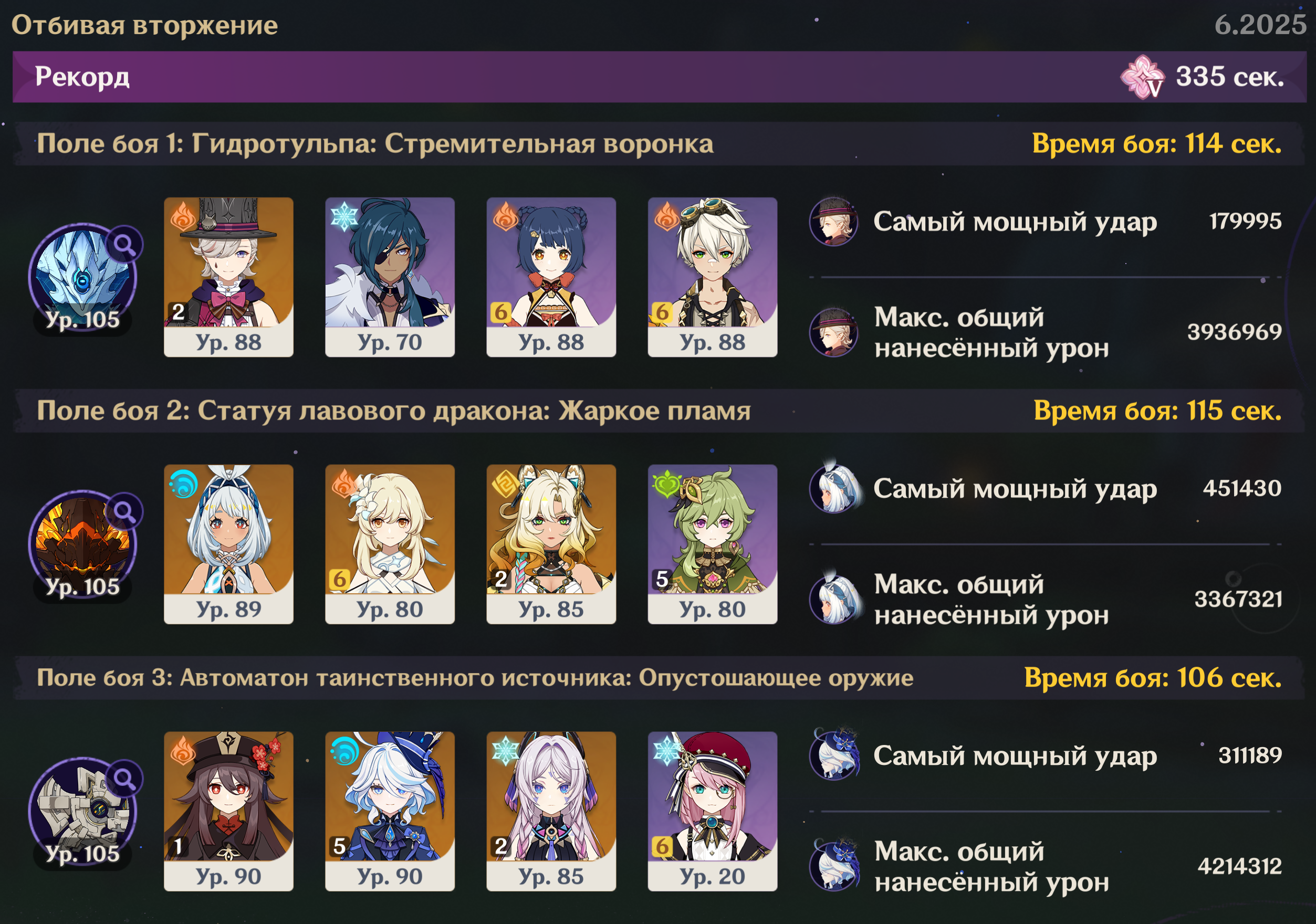 Охереть пчелы, я всё-таки закрыл пятую. Три дня ретраев... В итоге каждый стейдж закрыл какими-то абсурдными пачками, но по-другому никак. Как бы я не тасовал персов шансы были только в такой комбинации. В первой как долбаёб каждые 20 сек бегаешь Кэйей с церемоном тыкаешь минитульп. А ещё чтобы пробить щит надо обязательно затаймить двойной зактрут Сянки в двойной поляне Бениса. Сдавать холды Лини в поляне Бениса без щита против тульпы это вообще отдельное удавольствие. Одна ошибка и ты в могиле. Это наверное был самый потный стейдж для меня. Во второй С0 Акулка с казиком проходит только если оба раза подряд заролять ноту на аффикс. Немного брутфорса, а в целом этот стейдж не особо запарный. В принципе, прожаркой с Лини он тоже проходился. Пройти третий стейдж не имея Скирк, Скуфьи и Яяки в начале казалось вообще не возможным. Что я туда только не траил. В итоге пришел к форвард вейп Фуре из кармана. Шарлотта тут просто открытие, её e+q просто изничтожает криошкалу зарядки. Даже не качанная заовнила. В итоге, как и ожидалось, перо слил в никуда, но хотя бы победное ощущение закрытого контента осталось.