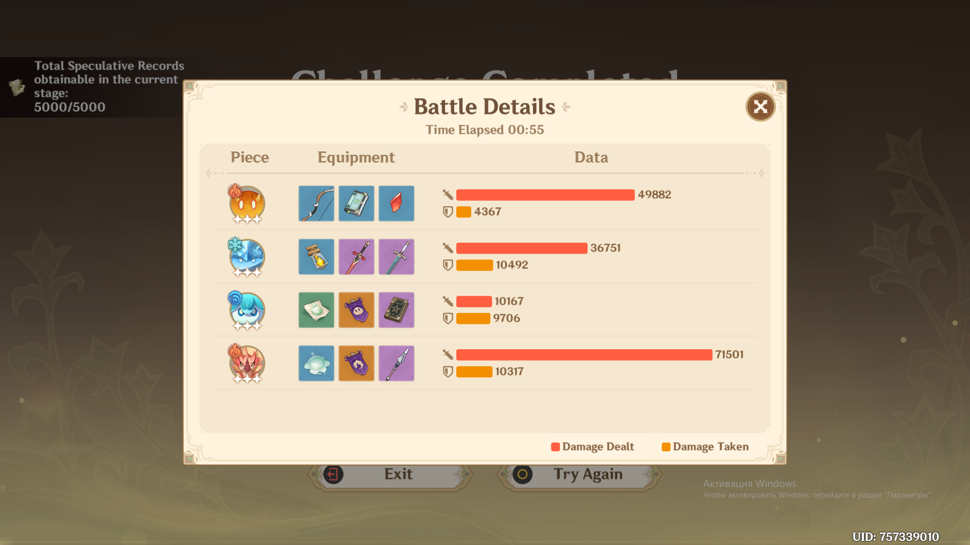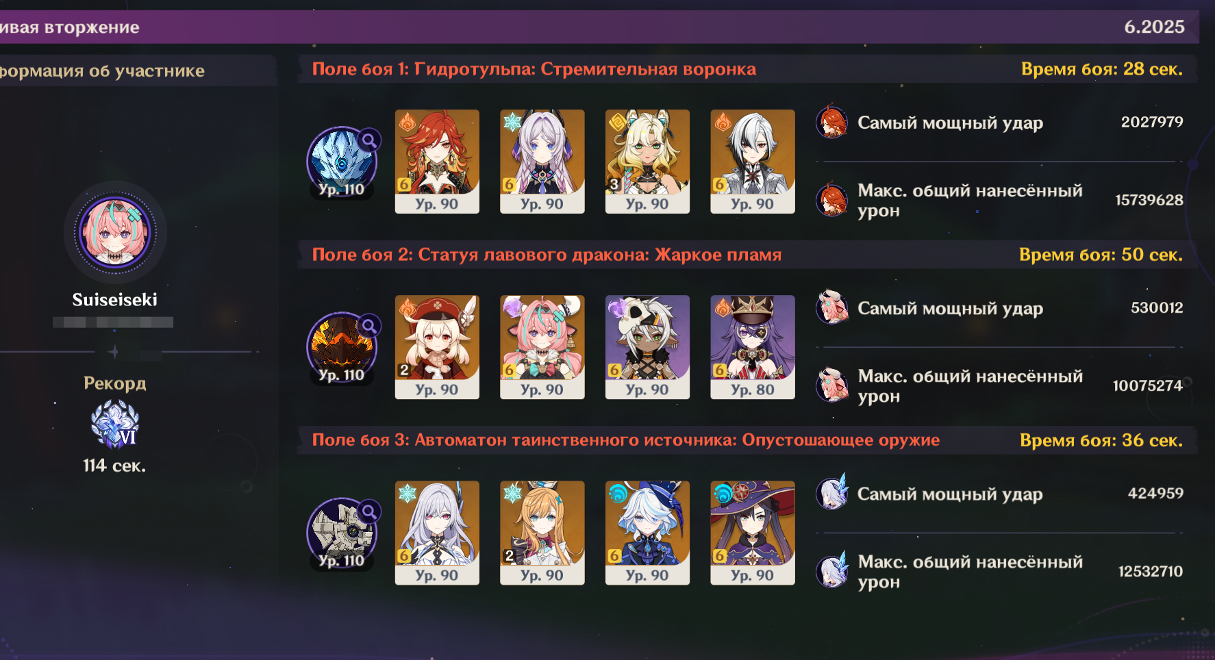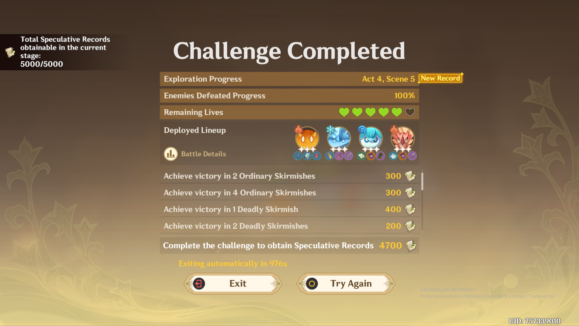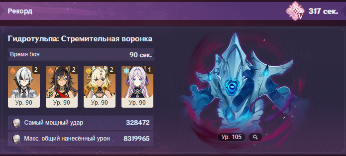 Охереть пчелы, я всё-таки закрыл пятую. Три дня ретраев... В итоге каждый стейдж закрыл какими-то абсурдными пачками, но по-другому никак. Как бы я не тасовал персов шансы были только в такой комбинации. В первой как долбаёб каждые 20 сек бегаешь Кэйей с церемоном тыкаешь минитульп. А ещё чтобы пробить щит надо обязательно затаймить двойной зактрут Сянки в двойной поляне Бениса. Сдавать холды Лини в поляне Бениса без щита против тульпы это вообще отдельное удавольствие. Одна ошибка и ты в могиле. Это наверное был самый потный стейдж для меня. Во второй С0 Акулка с казиком проходит только если оба раза подряд заролять ноту на аффикс. Немного брутфорса, а в целом этот стейдж не особо запарный. В принципе, прожаркой с Лини он тоже проходился. Пройти третий стейдж не имея Скирк, Скуфьи и Яяки в начале казалось вообще не возможным. Что я туда только не траил. В итоге пришел к форвард вейп Фуре из кармана. Шарлотта тут просто открытие, её e+q просто изничтожает криошкалу зарядки. Даже не качанная заовнила. В итоге, как и ожидалось, перо слил в никуда, но хотя бы победное ощущение закрытого контента осталось.