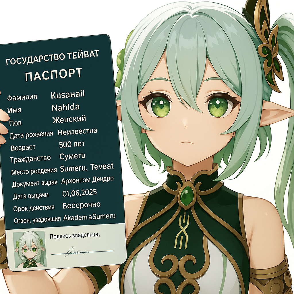 - Товарищ майор, нахиде 500 лет, ща пруф покажу - Нахида-сама, будь добра, покажи паспорт - Хорошо, мой анончик - Вот, а ты не верил! Можно теперь контент с ней постить?