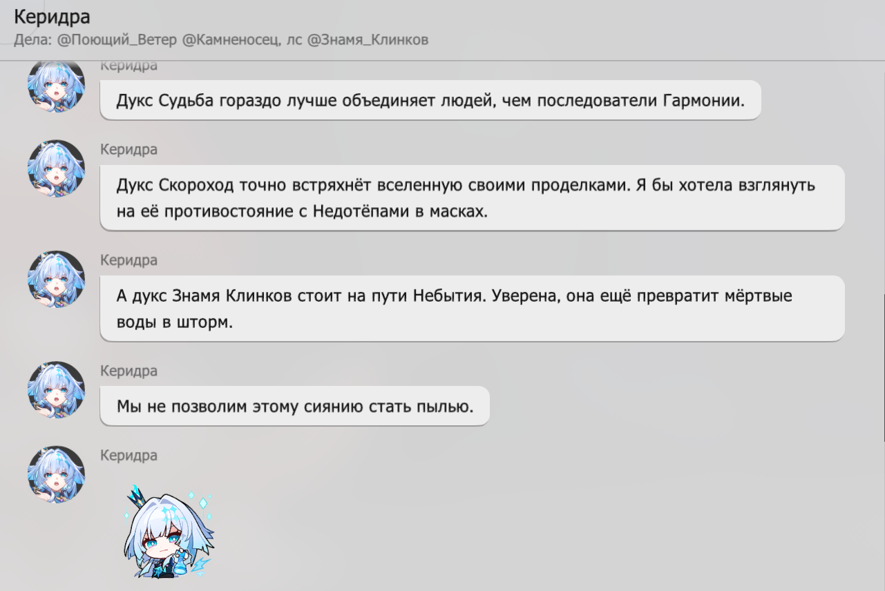 Ещё можно коупить по поводу Реки в 3.8. Но что-то мне кажется, что его предназначение будет заменить ГГ в ЕЁ пачке, а не Гиацину. Безсус из в1-в2 у неё убили, так что и в 3 баффера Памяти (ГГ, Кирена Река) один хуй не поиграть.