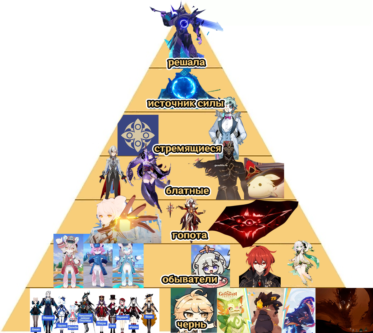 >>5151122 Впору делать пирамиду власти в Тейвате, как ту иерархию жителей Фонтейна. Где наверху будет кто угодно: тени Фанета, ведьмы, грешники, сошедшие, а архонты в самом низу, как ни на что не влияющие персонажи.