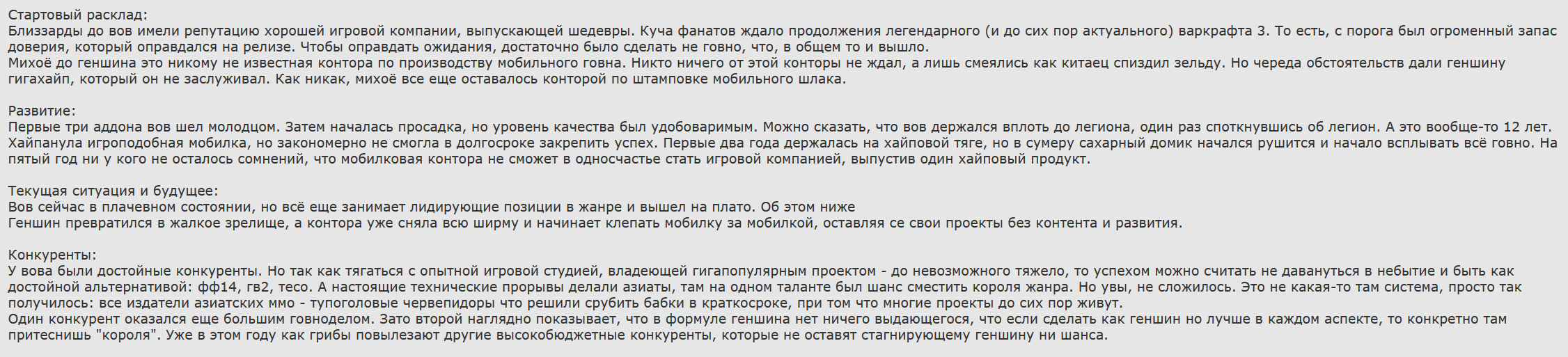 >>5151205 >очередное сравнение гавниша с вовном Чел, вовно хотя бы лор имеет и преданных фанатов, которые лет десять играли не отходя от кассы. А Г скукожился в насране и катится в могилку.