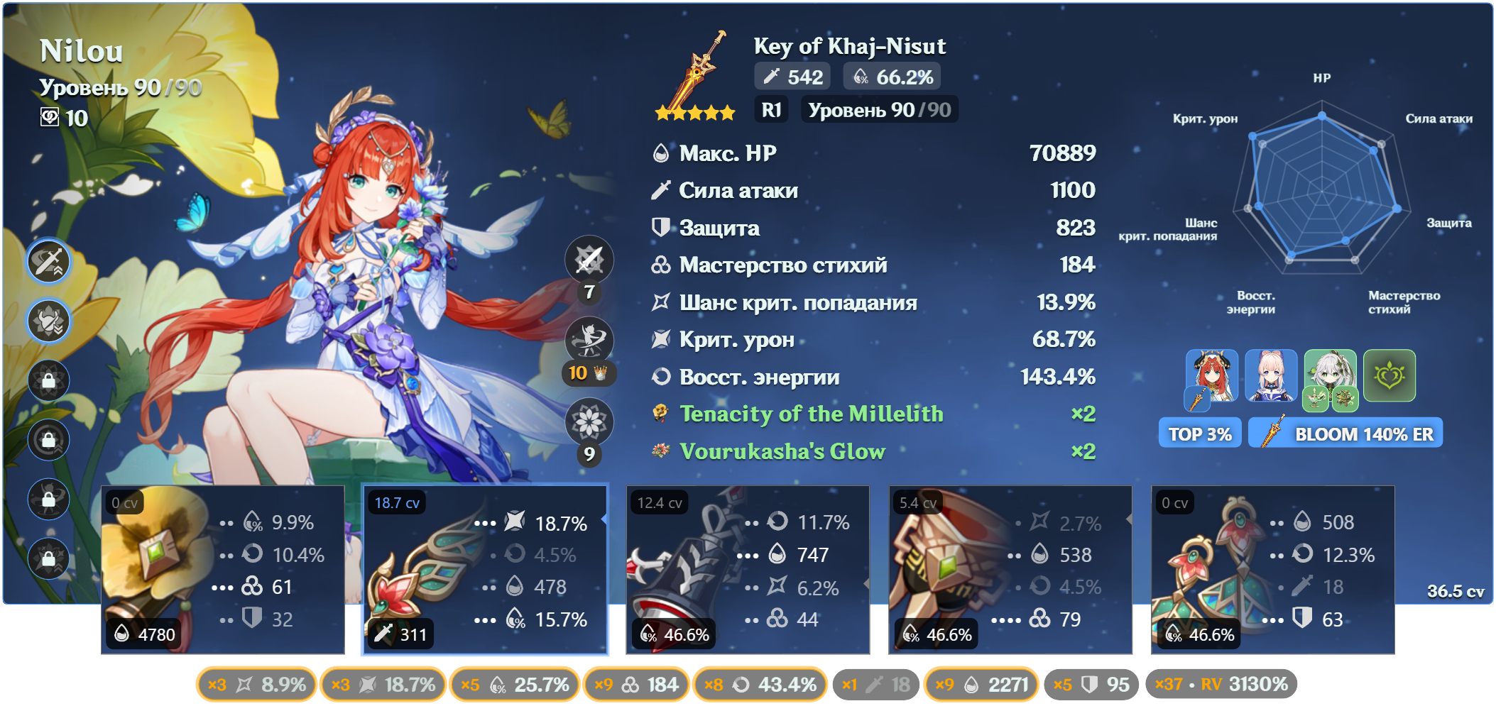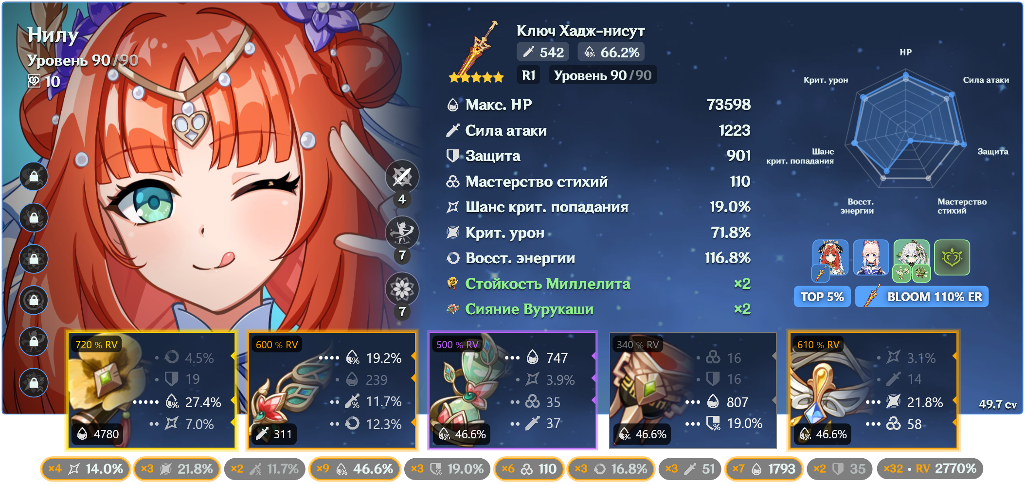 Без энергии она всё ещё баффает. В пачке с 1 нодкаловцем даёт +15% эффективного урона арбузов криты. И режет резисты к дендро и гидро. Но ульта тоже крайне важна и ее хочется нажимать каждую ротацию, а так как билдим мы ее фул мс и на криты кладем здоровенный болт просто статов не хватит, да и дамажит она не очень много, по сути у нее одна сильная тычка в ротации то надо как-то добрать калстановы. В некоторых пачках ей чуть ли не 200 калстановы надо. Да и с выходом нефер ее ульта станет ещё важнее так как бафф арбузов с ульты не так критичен как бафф директ лунар блум урона поскольку этот бафф скейлится от критов и реакшн бонуса нефер.