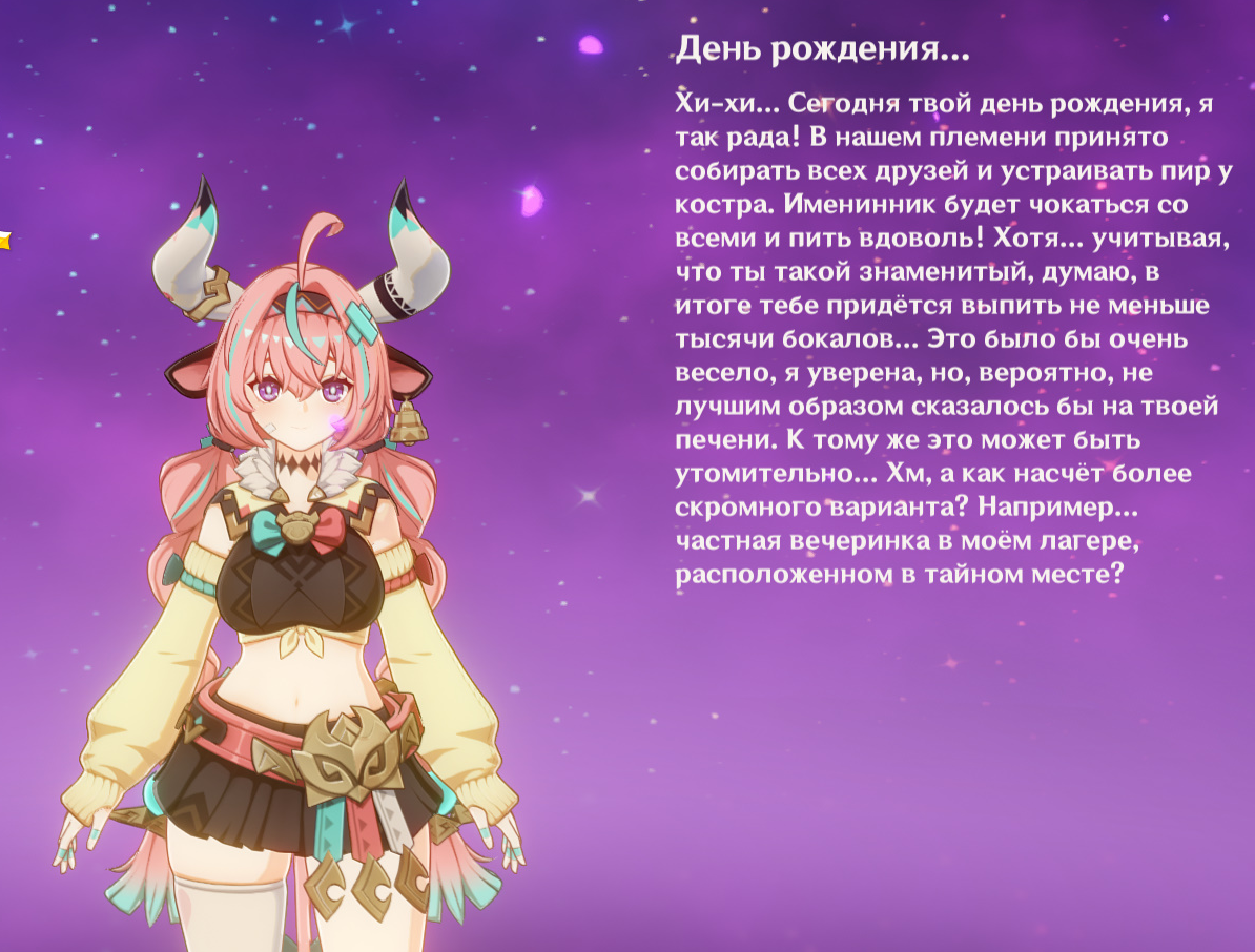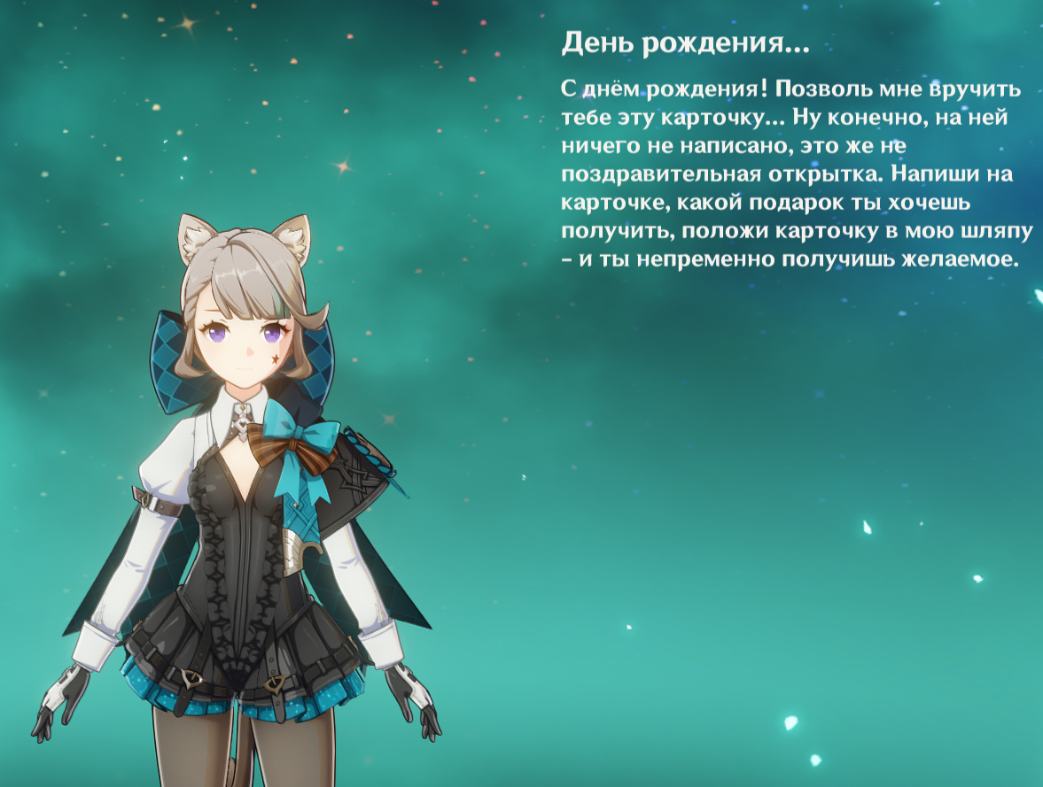 А смотрите какое у Шенхе пятизвёздочное поздравление. Только чего она такую инициативу берёт словно мужик, а я девочка? А Вареса вообще в свою коморку зачем-то тащит. Прикольно же. Линет предлагает достать из шляпы что пожелаешь. Но как она в шляпу поместится? Самое милое поздравление у Кли, а самое тупое у лисички, но смешное. Сейчас еще смешное у Кирары покажу ниже.