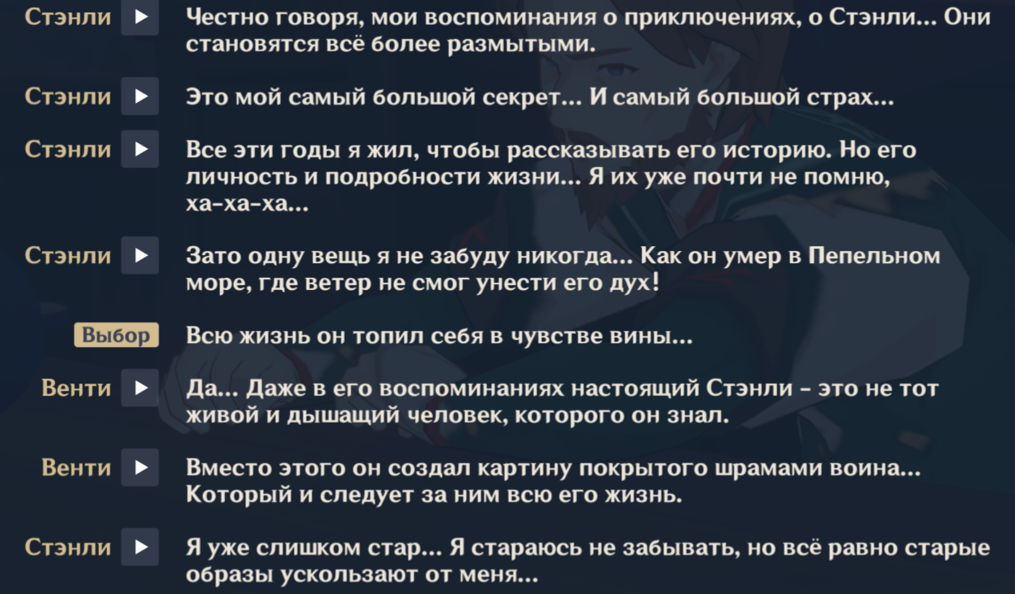 Ньювжушк на ночной связи. Сейчас от скуки закрываю совсем древний контент. Квесты персонажные 1.х версий. Насколько же слабее они были, часть ещё ничего так, типа Кли или Деда, но некоторые чисто пяти минутный лор растянуть на полчаса вроде Джинн или Дилюка. Но я не по этому поводу, чего пишу то, я реткон заметил. Как мы знаем из последнего квеста Натлана, Венти запечатал Пепельное море несколько столетий назад, но все типа не одупляют этого, это ок, но как это вяжется с вот этим челом, у которого друг несколько десятков лет назад там умер? И Венти даже ухом не ведёт, он даже нам об этом ни слова не говорит. Не, ну допустим нам не говорит, так как не доверяет ещё, но очевидные проёбы, не? Не, я нашёл там пару фраз, которые можно натянуть на глобус и оправдать ляо, но это очевиднейший реткон.
