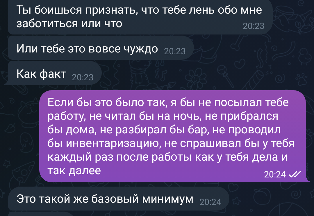 >>5512017 Ну ахуеть базовый минимум. А что тогда ей надо вообще? Если это не забота, а стандартное поведение, то что тогда в её понимании такое забота?