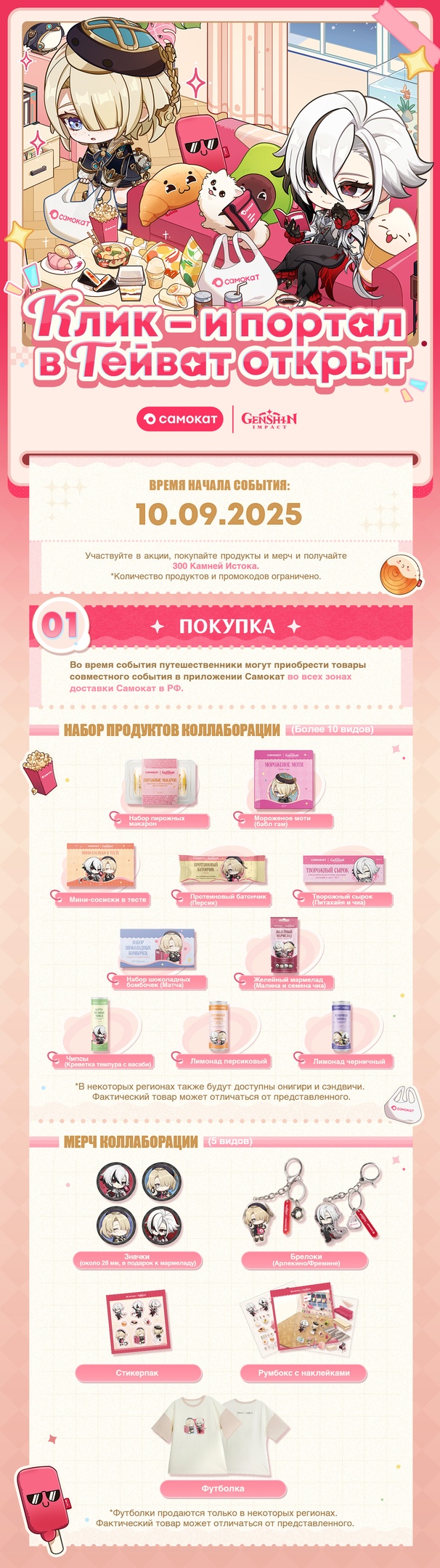 🔸 В период события переходите в приложение Самокат, приобретайте товары из подборки на 800 рублей, чтобы получить подарочные наборы (Камни Истока ×300, именную карту «Великое пиршество II» ×1 и выпечку с яблоками золотого цвета ×1). *Обязательно выполните первый вход на тематической странице игры «Портал в Тейват» в приложении Самоката перед покупкой, иначе вы не сможете получить промокод.