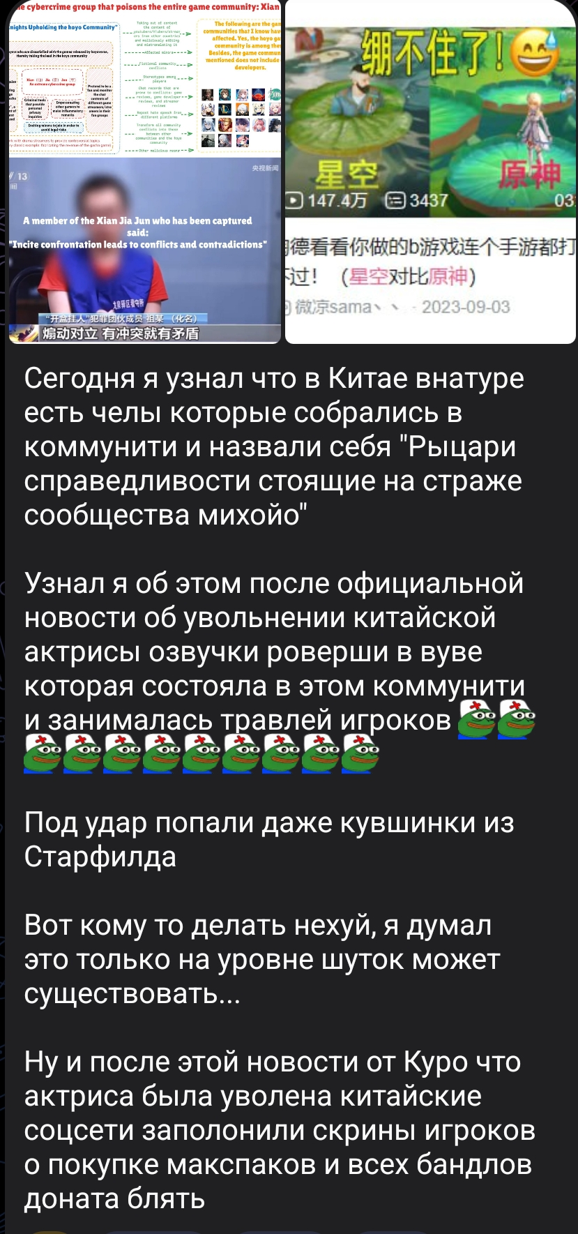 Читали новости? Китайская актриса Кокоми и по совместительству фем гг в вуве состояла в какой-то ляомафии, которая деанонила фанатов вувы и других гач, с вувы её уже пидорнули. Примечательно, что на релизе Кокоми её саму буллили геншинята.