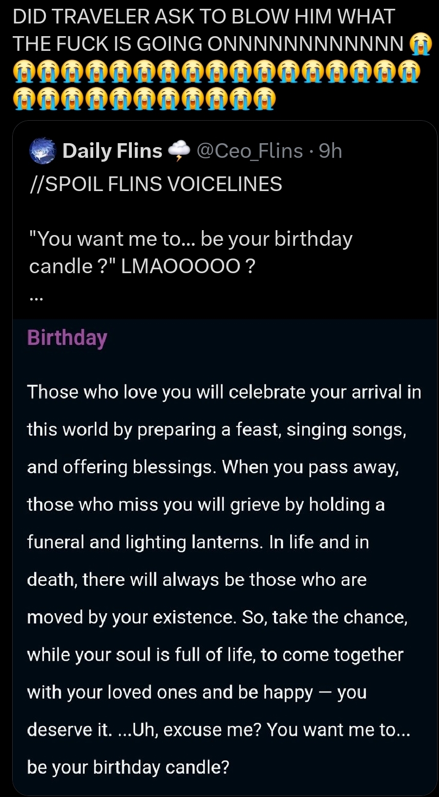 Чат это правда? В самом закомплексованном гача-сообществе - Вуве, инцелы обнаружили, что актриса озвучки женской версии ГГ - Гуи Нианг скрытая (не очень) фанатка Геншина. После чего её объявили экстремисткой и уволили.